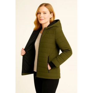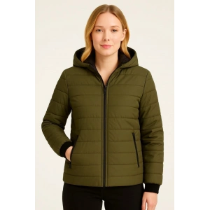 Kadın Şişme Kapüşonlu Fermuarlı Mont Su itici Kapitone Astarlı Kumaş Cepli Kışlık Rahat Kalıp - Haki