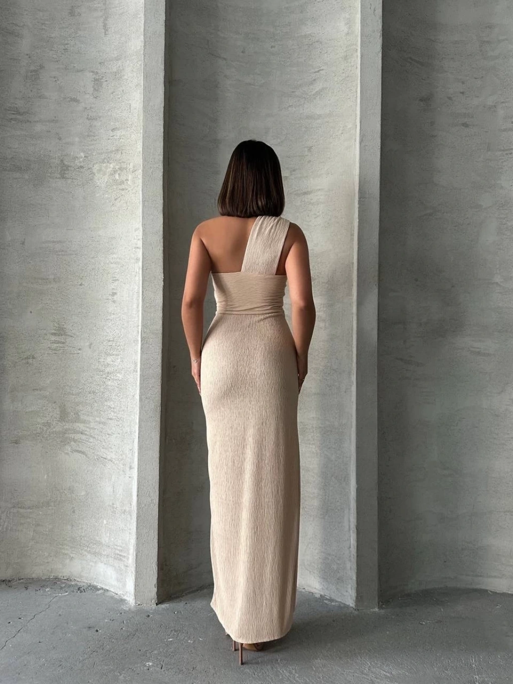 KAZAX marka tek omuz pliseli elbise, şıklık ve zarafeti bir araya getiriyor. Bu tasarım, özel davetlerde ve özel günlerde kendinizi prenses gibi hissetmenizi sağlar.