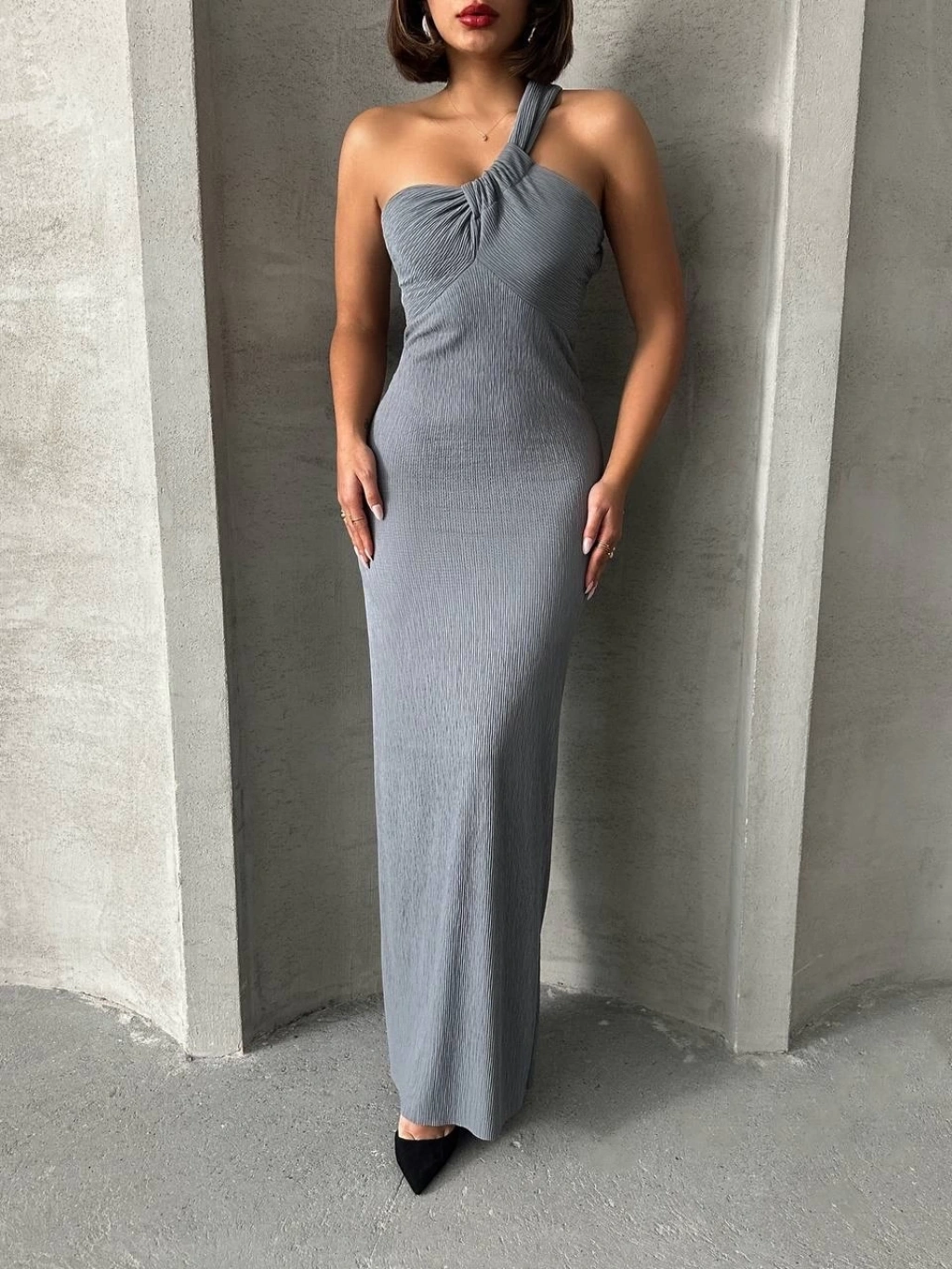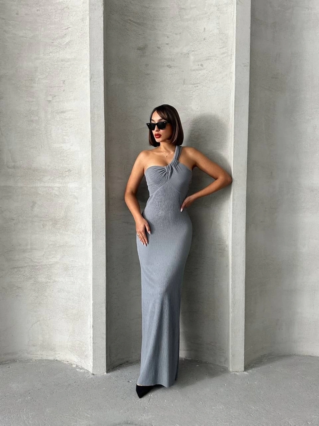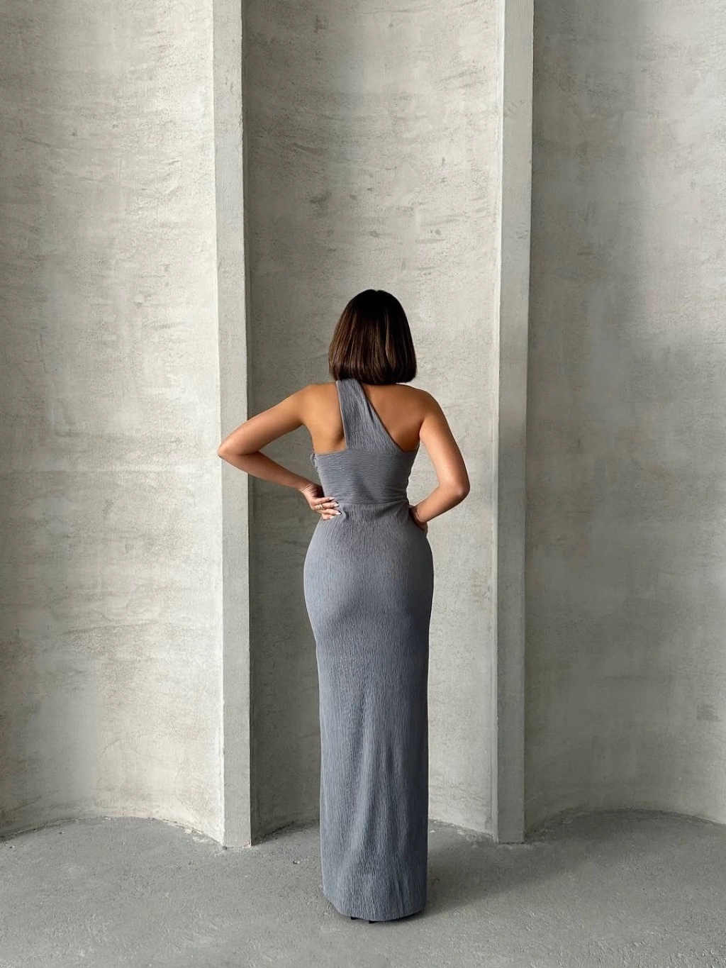 Kendinden kemerli uzun elbise vizon