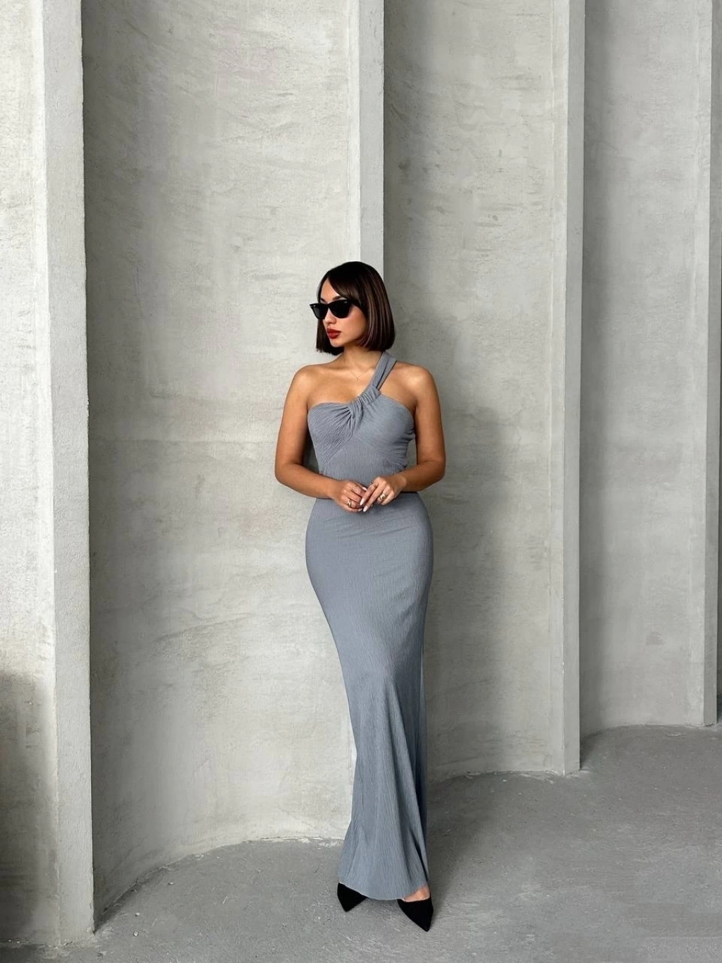Boğazlı kalın bürümcük uzun elbise siyah