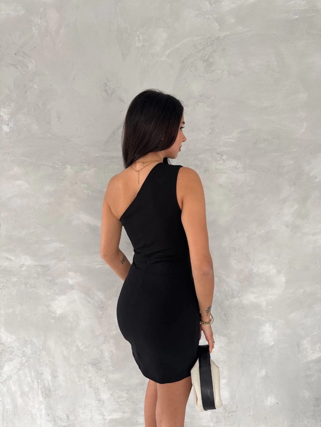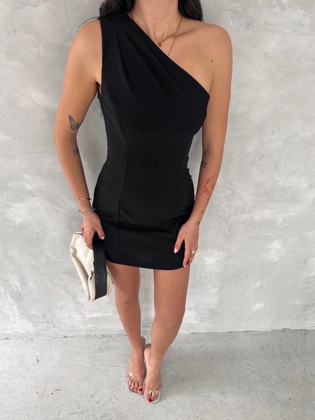 Kadın Göğsü Bağlamalı Kalp Yaka Kolları Şifon Mini Elbise - Siyah