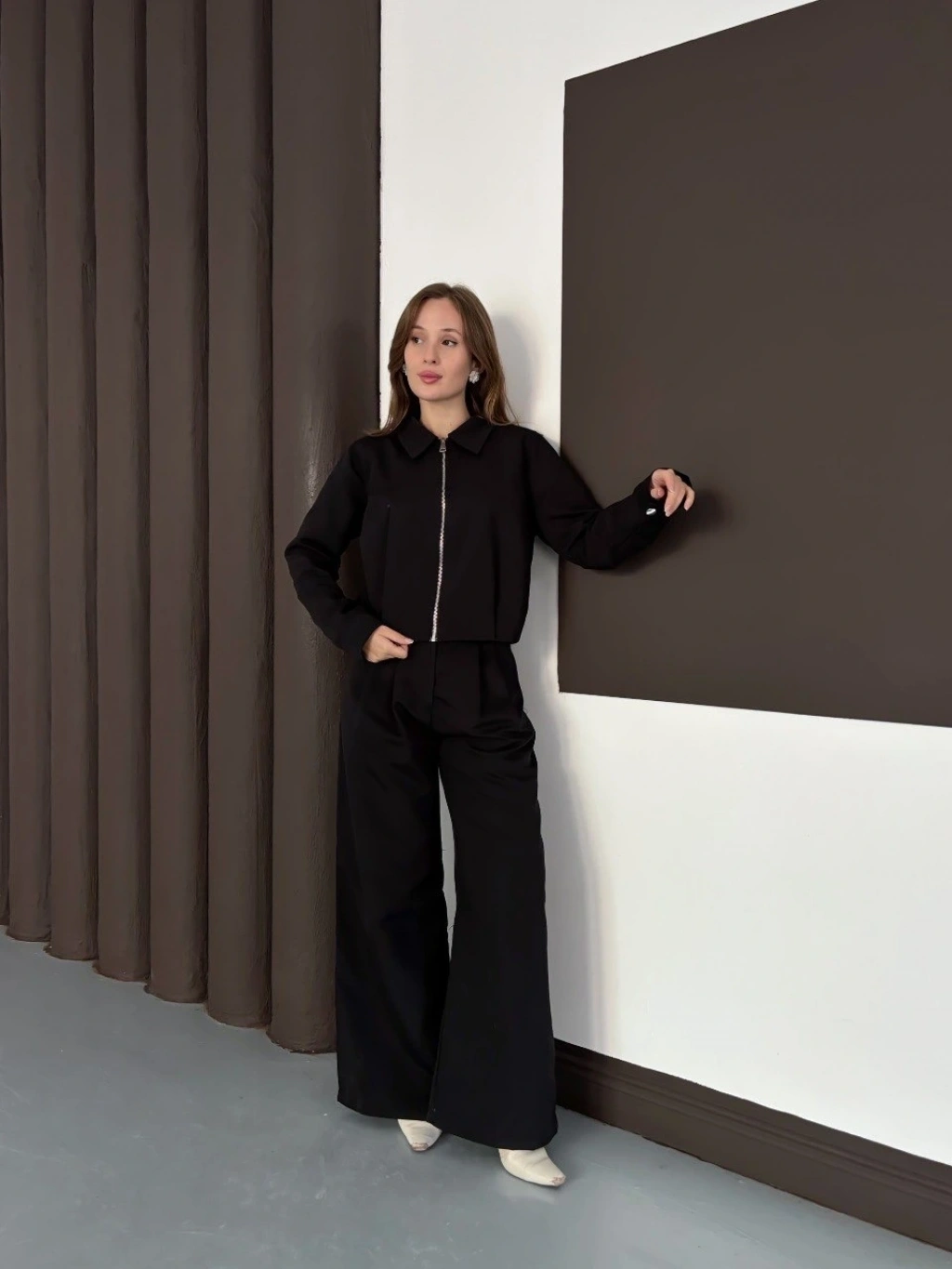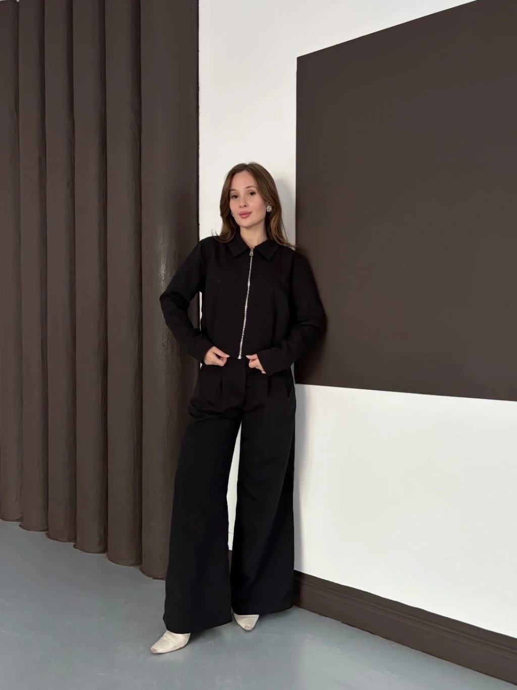 3 iplik içi Şardonlu yarım fermuarlı alt üst takım siyah