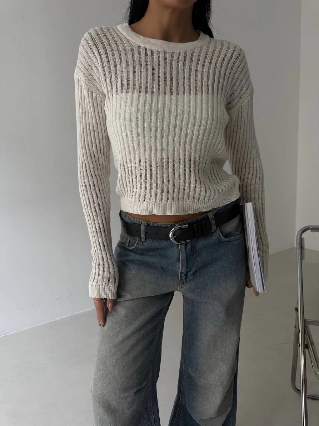 Çizgili ispanyol kol triko boğazlı kazak beyaz elf