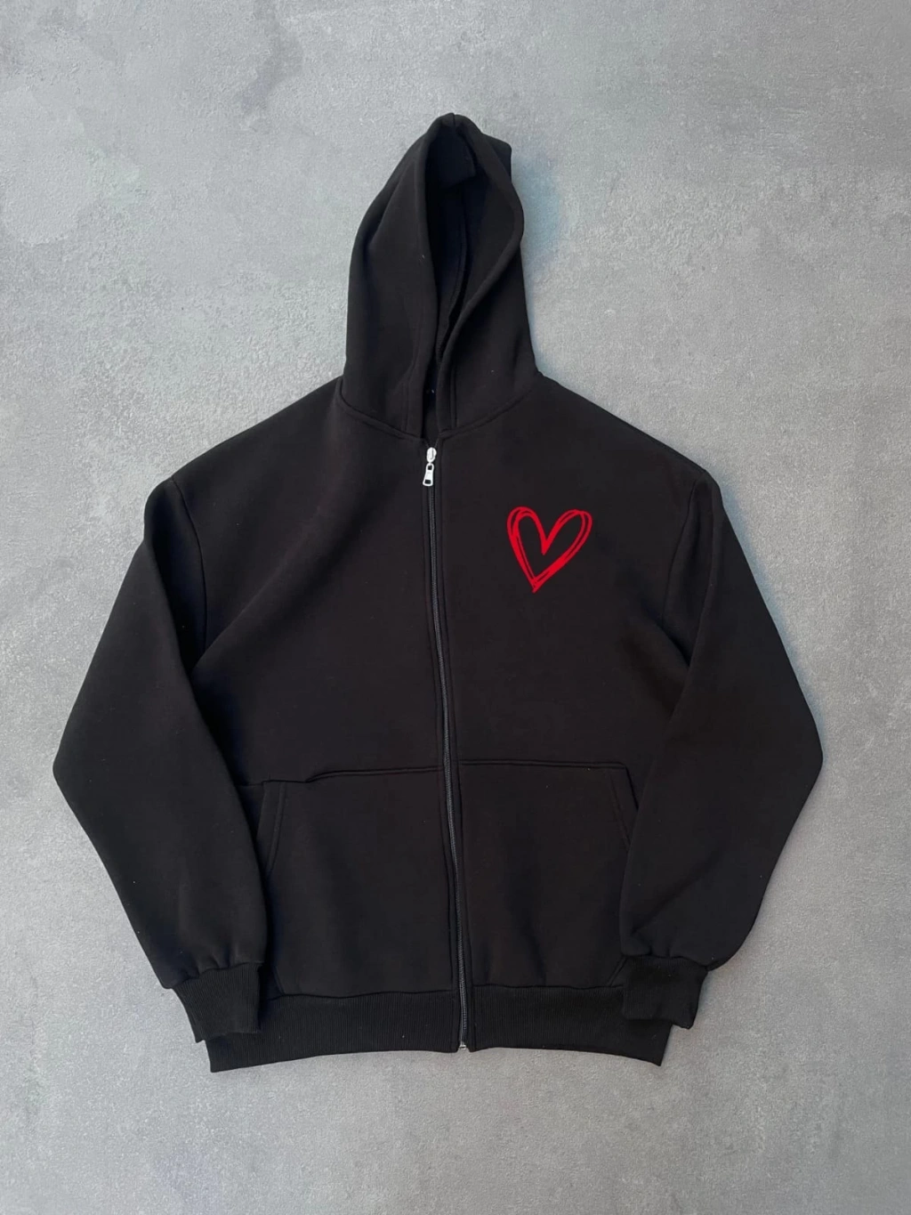 Üç İplik Baskılı Fermuarlı Kapüşonlu Hırka - Siyah