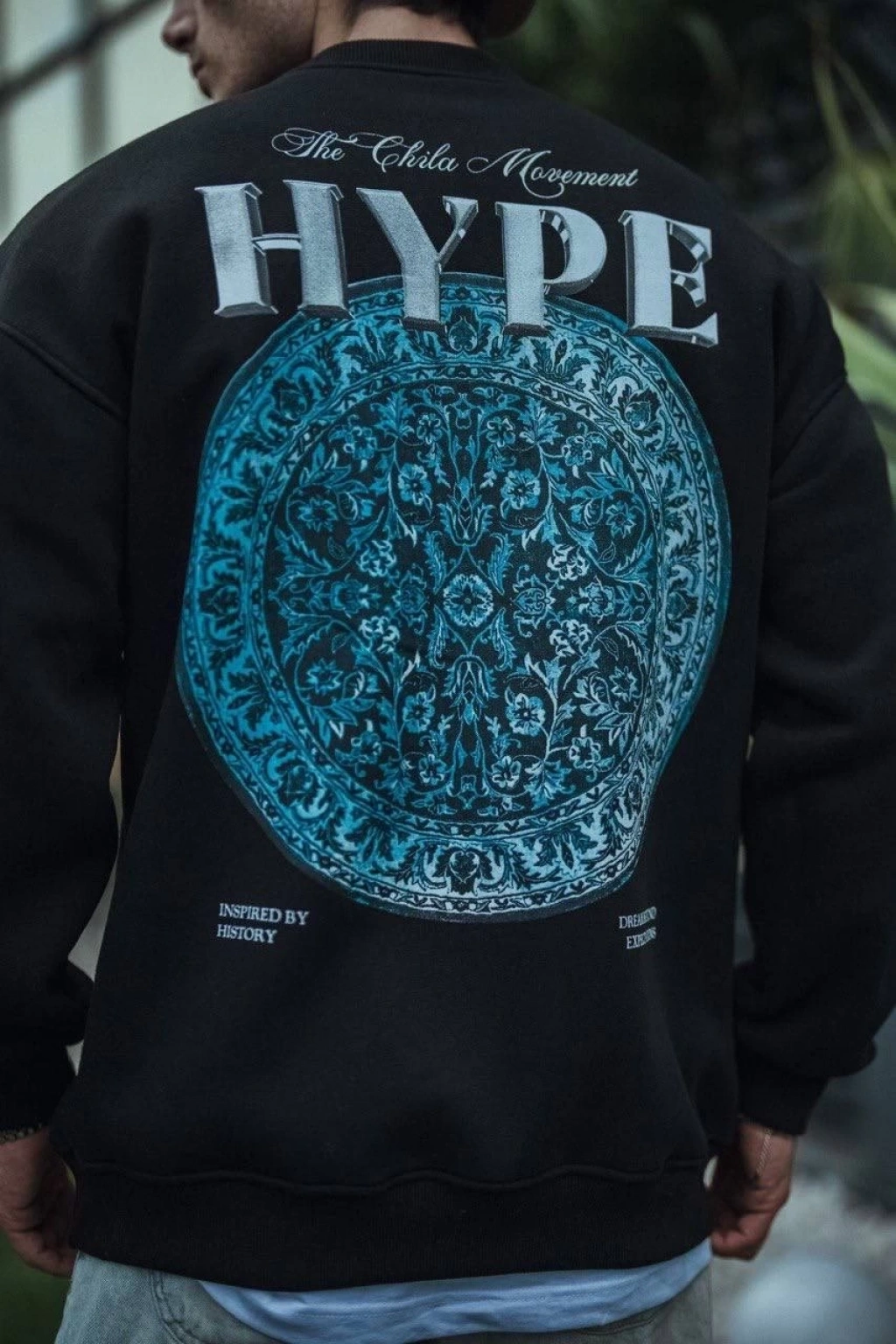 Erkek Oversize Üç İplik Kapüşonlu Sweat – Siyah Kol ve Etek Ribana Detaylı, Ön ve Sırt Baskılı, Kanguru Cepli Rahat Kalıp Model