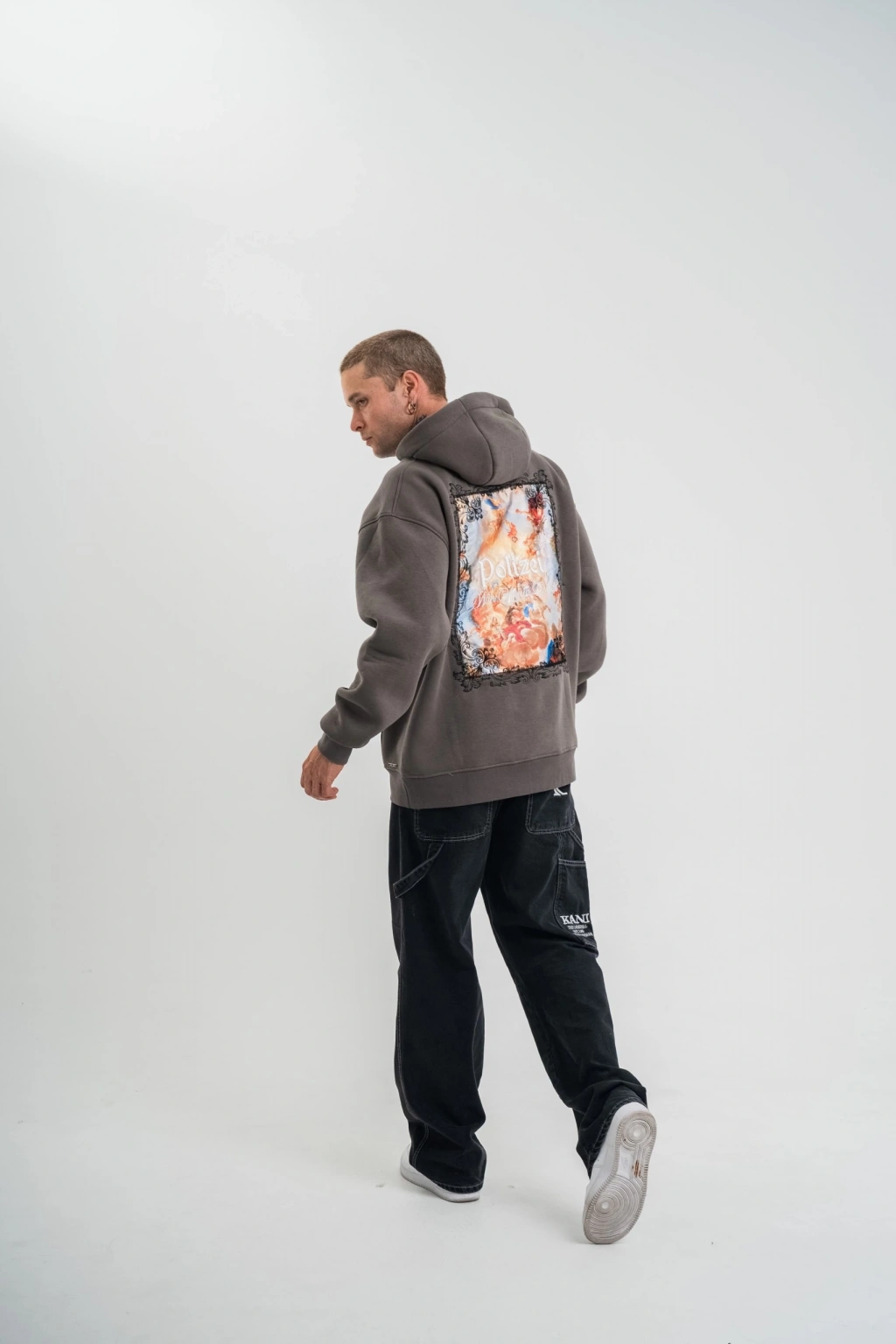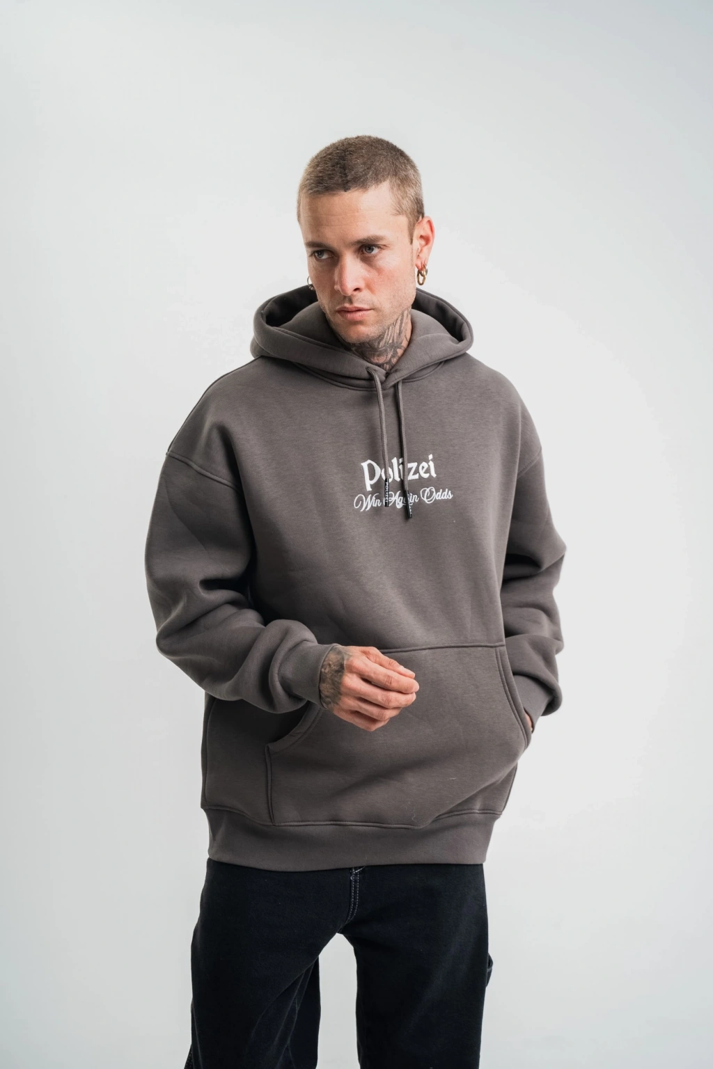 Erkek Nakış İşlemeli Kapşonlu Antrasit Sweatshirt Üç İplik Double Oversize- Füme