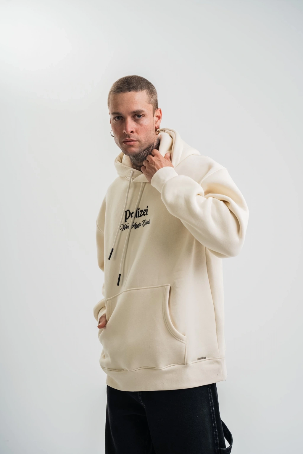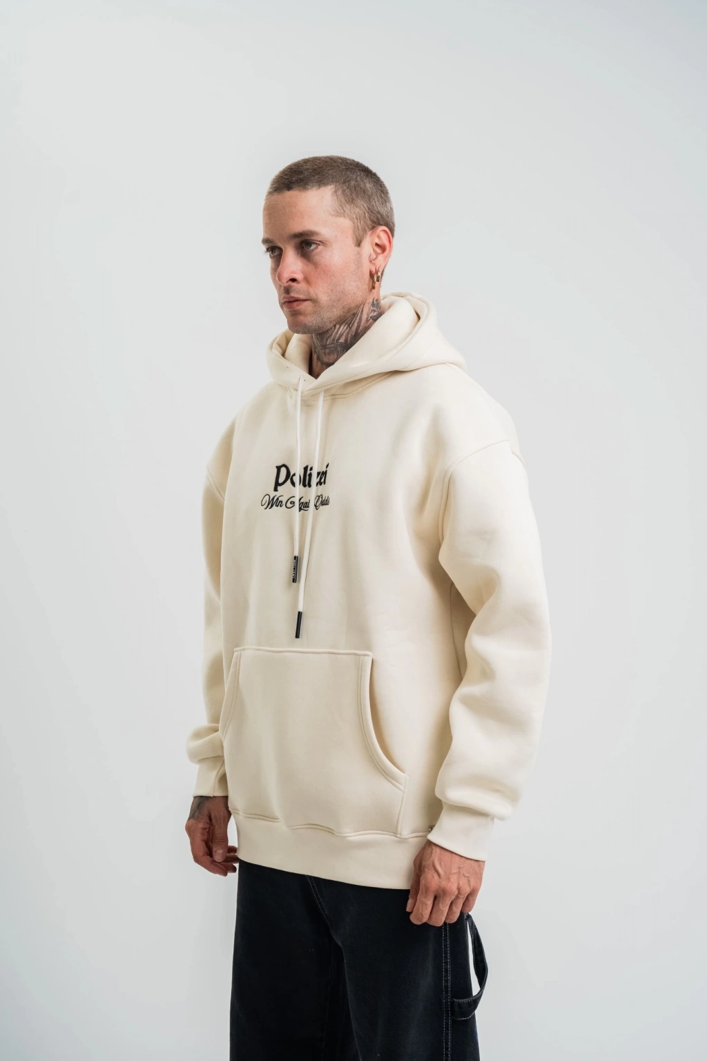 Erkek Oversize Üç İplik Kapüşonlu Sweatshirt – Beyaz Ön Baskılı, Kanguru Cepli, Rahat Kalıp, İçi Pamuklu Model