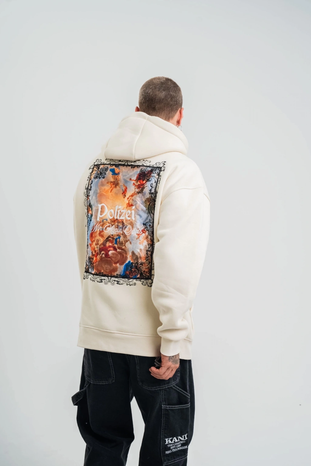 Erkek Oversize Üç İplik Şardonlu Kapüşonlu Sweatshirt – Beyaz “Other Lives” Ön ve Arka Baskılı, Kanguru Cepli, Ribanalı Rahat Kışlık Model Beyaz