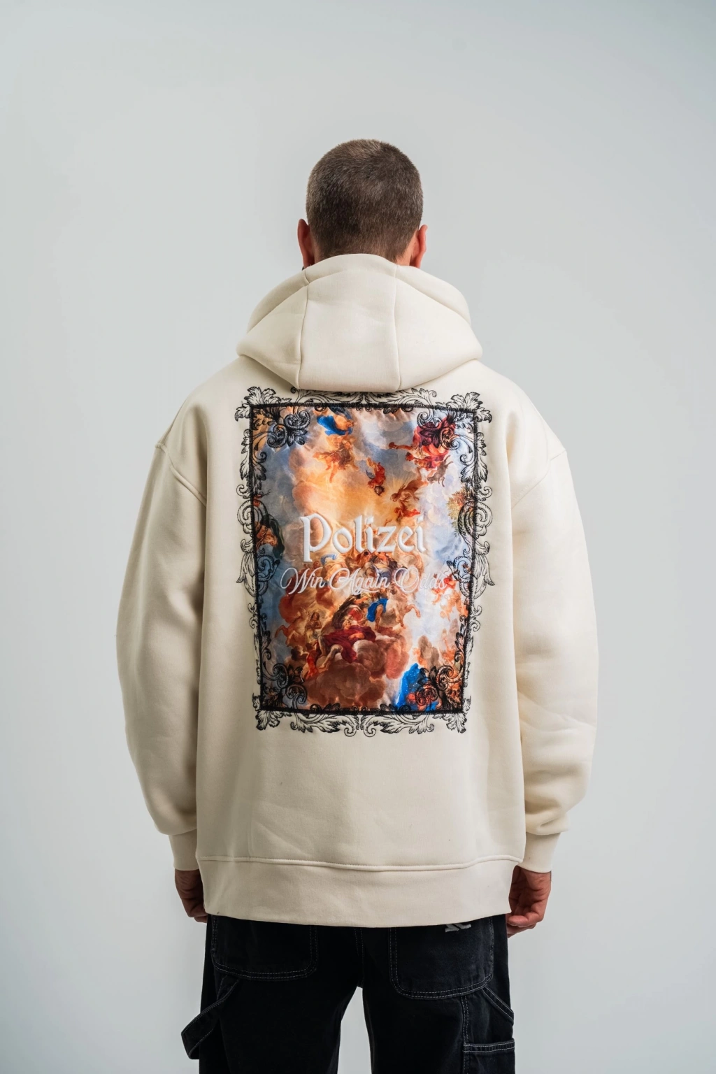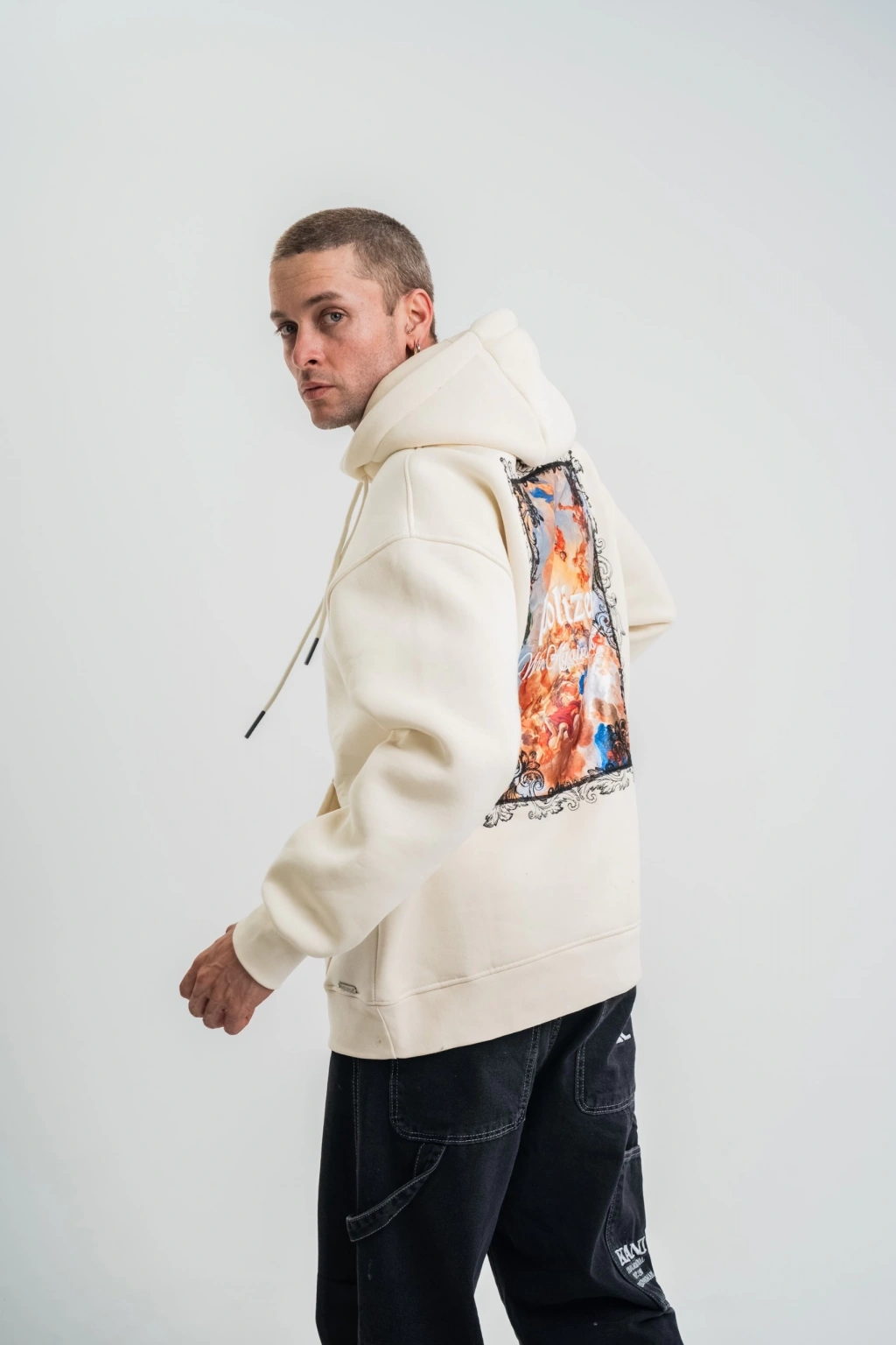Erkek Oversize Üç İplik Kapüşonlu Sweat – Kol ve Etek Ribana Detaylı, Ön ve Sırt Baskılı, Kanguru Cepli Rahat Kalıp Model - Beyaz