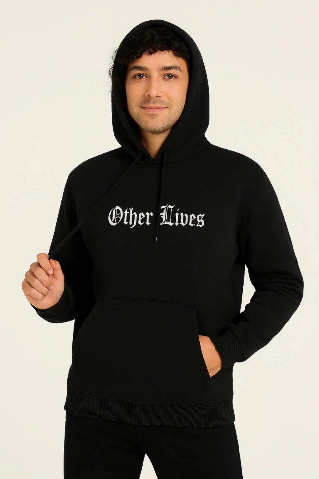 Erkek Oversize Üç İplik Şardonlu Kapüşonlu Sweatshirt – Beyaz “Other Lives” Ön ve Arka Baskılı, Kanguru Cepli, Ribanalı Rahat Kışlık Model Beyaz