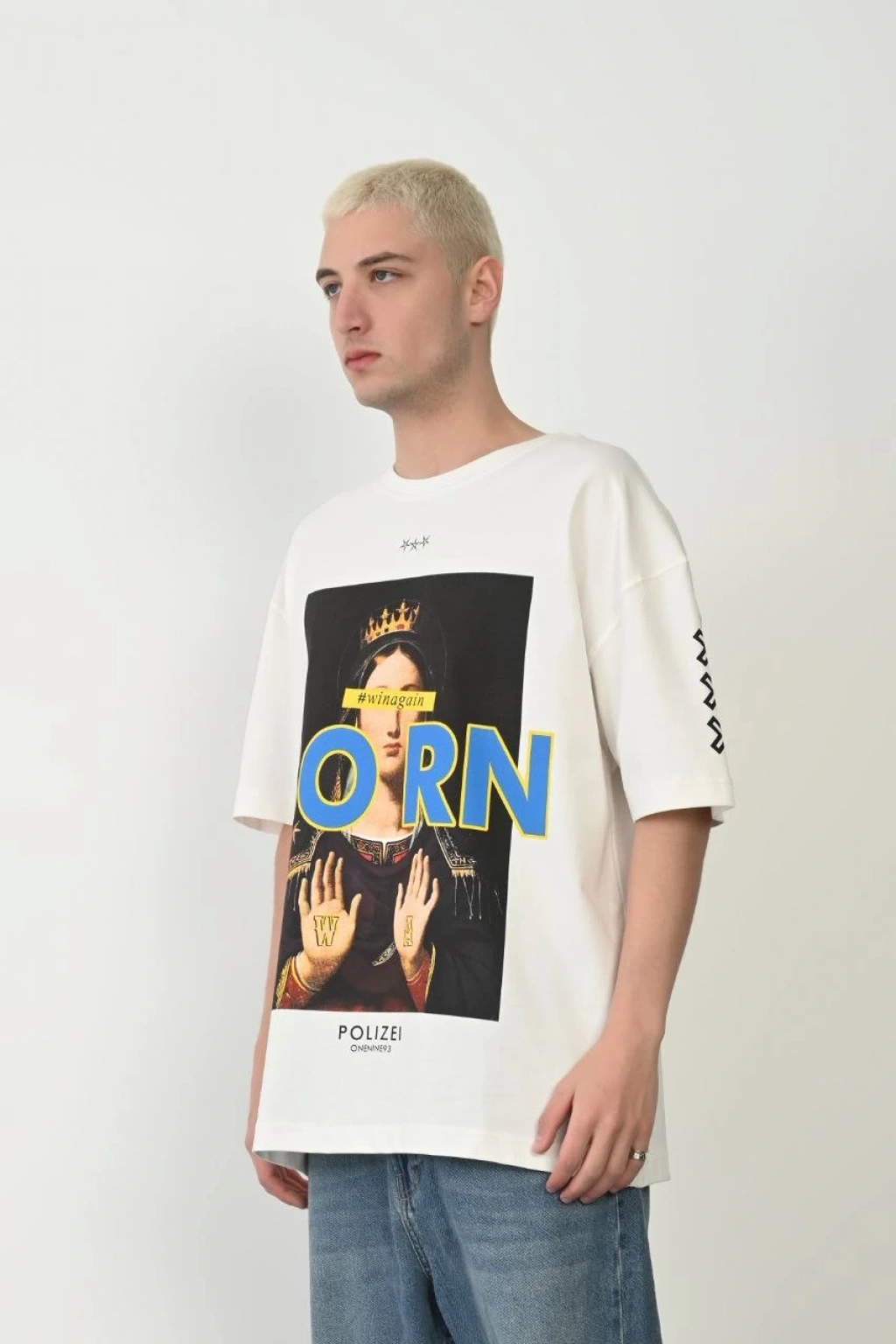 Unisex Baskılı Bisiklet Yaka Oversize T-Shirt - Beyaz