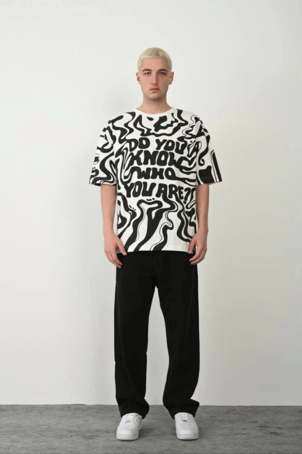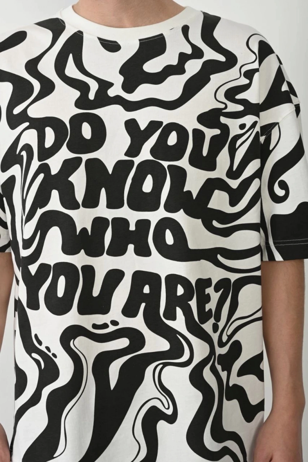 Unisex Baskılı Bisiklet Yaka Oversize T-Shirt - Beyaz