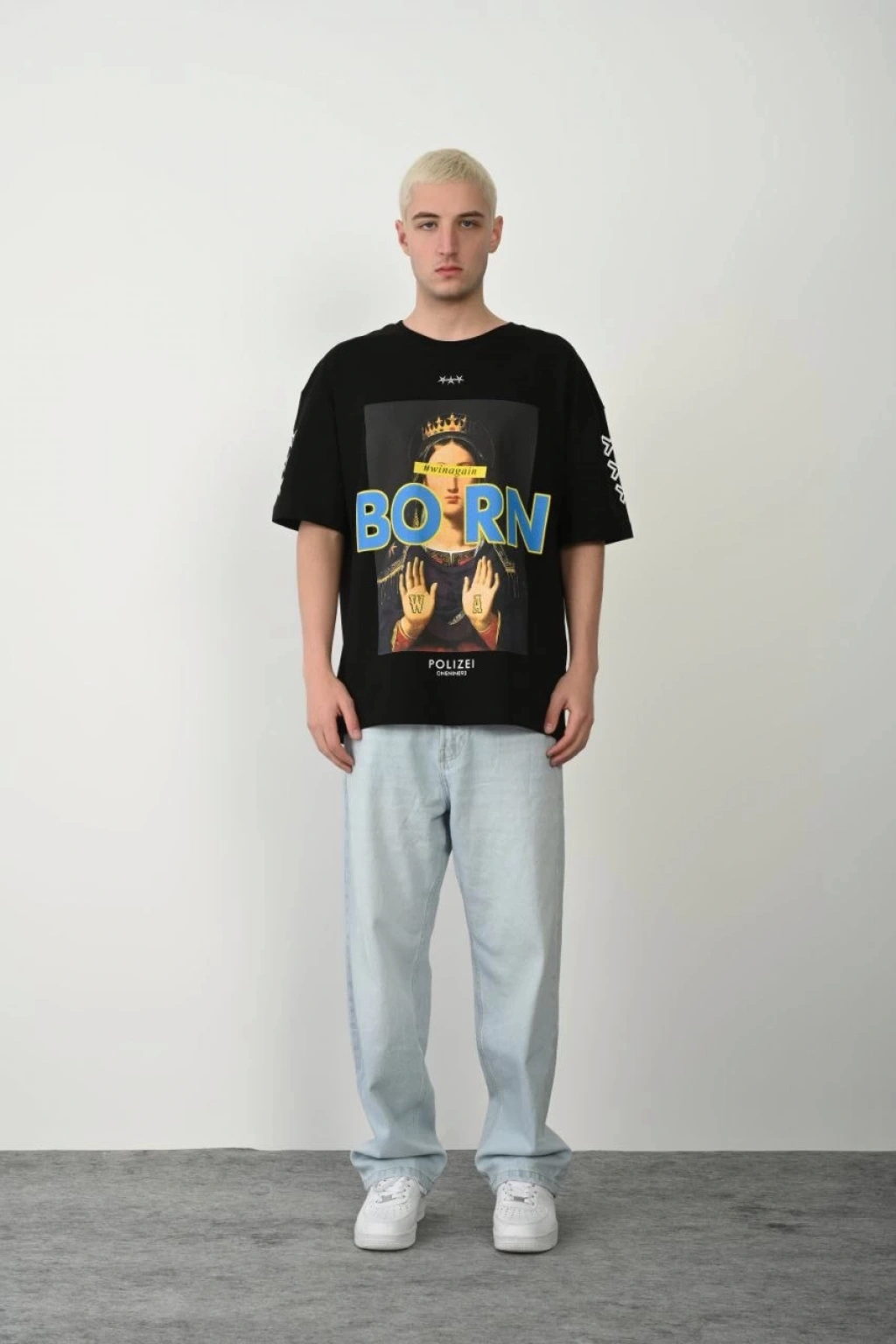 Unisex Baskılı Bisiklet Yaka Oversize T-Shirt - Siyah