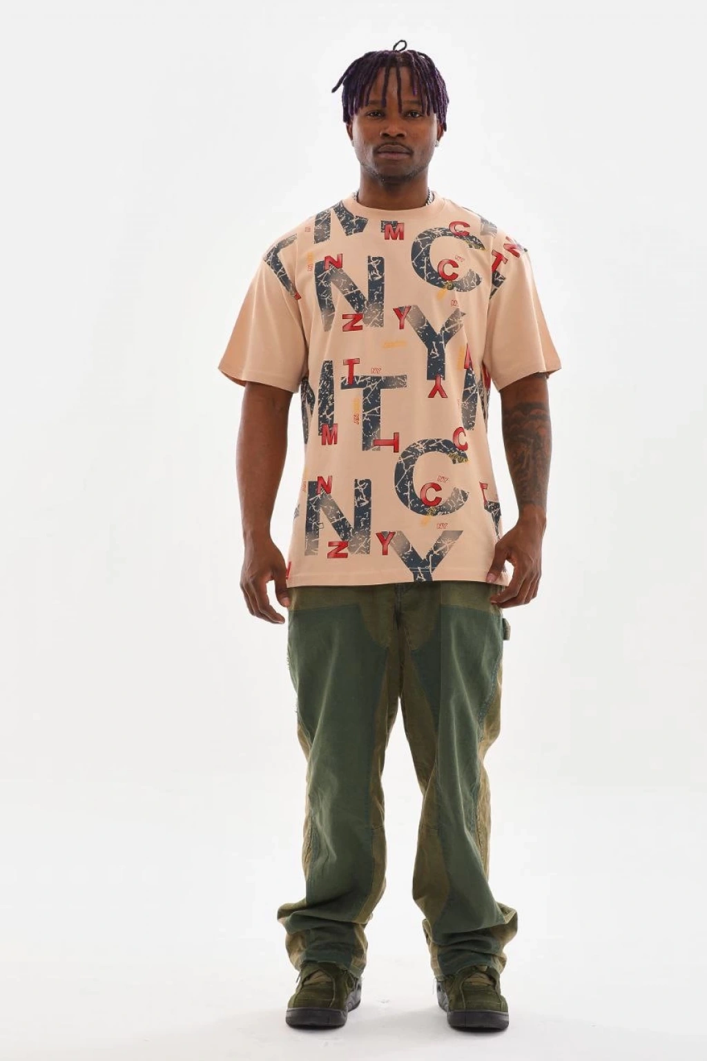 Erkek OversizeGrafik Tişört "CAMPBRASTCOOPERATION" Kalın Yazı Bisiklet Yaka, Kısa Kol, Kalın Mor ve Siyah Desenli Yazlık Sokak Kıyafeti - Siyah