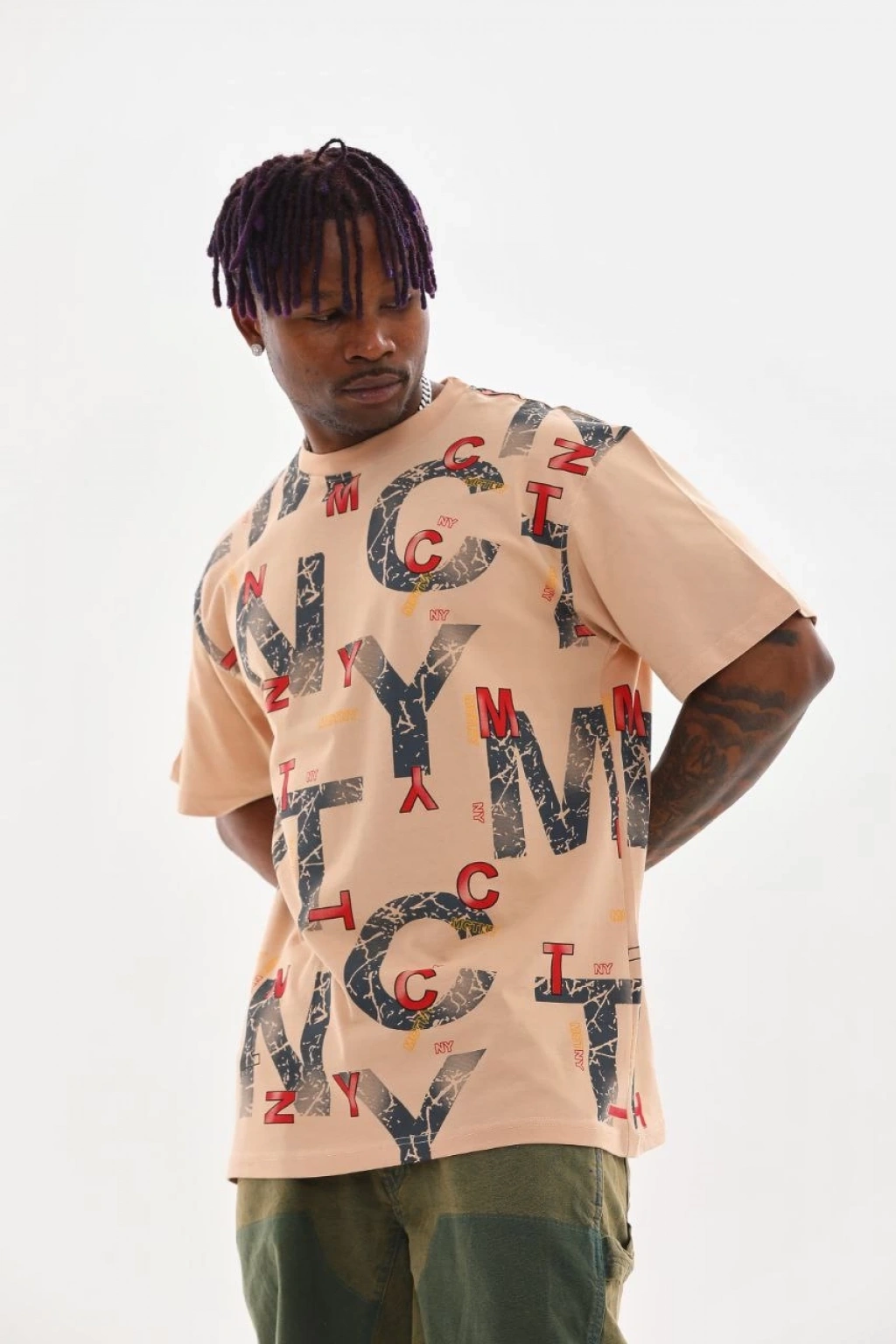 Erkek OversizeGrafik Tişört "CAMPBRASTCOOPERATION" Kalın Yazı Bisiklet Yaka, Kısa Kol, Kalın Mor ve Siyah Desenli Yazlık Sokak Kıyafeti - Beyaz