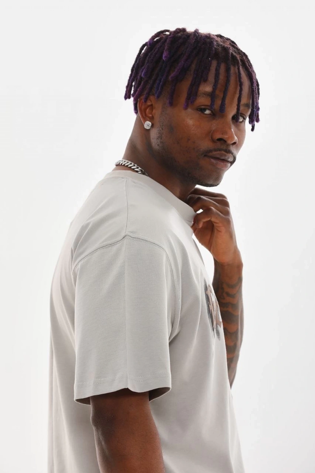 Erkek OversizeGrafik Tişört "CAMPBRASTCOOPERATION" Kalın Yazı Bisiklet Yaka, Kısa Kol, Kalın Mor ve Siyah Desenli Yazlık Sokak Kıyafeti - Beyaz