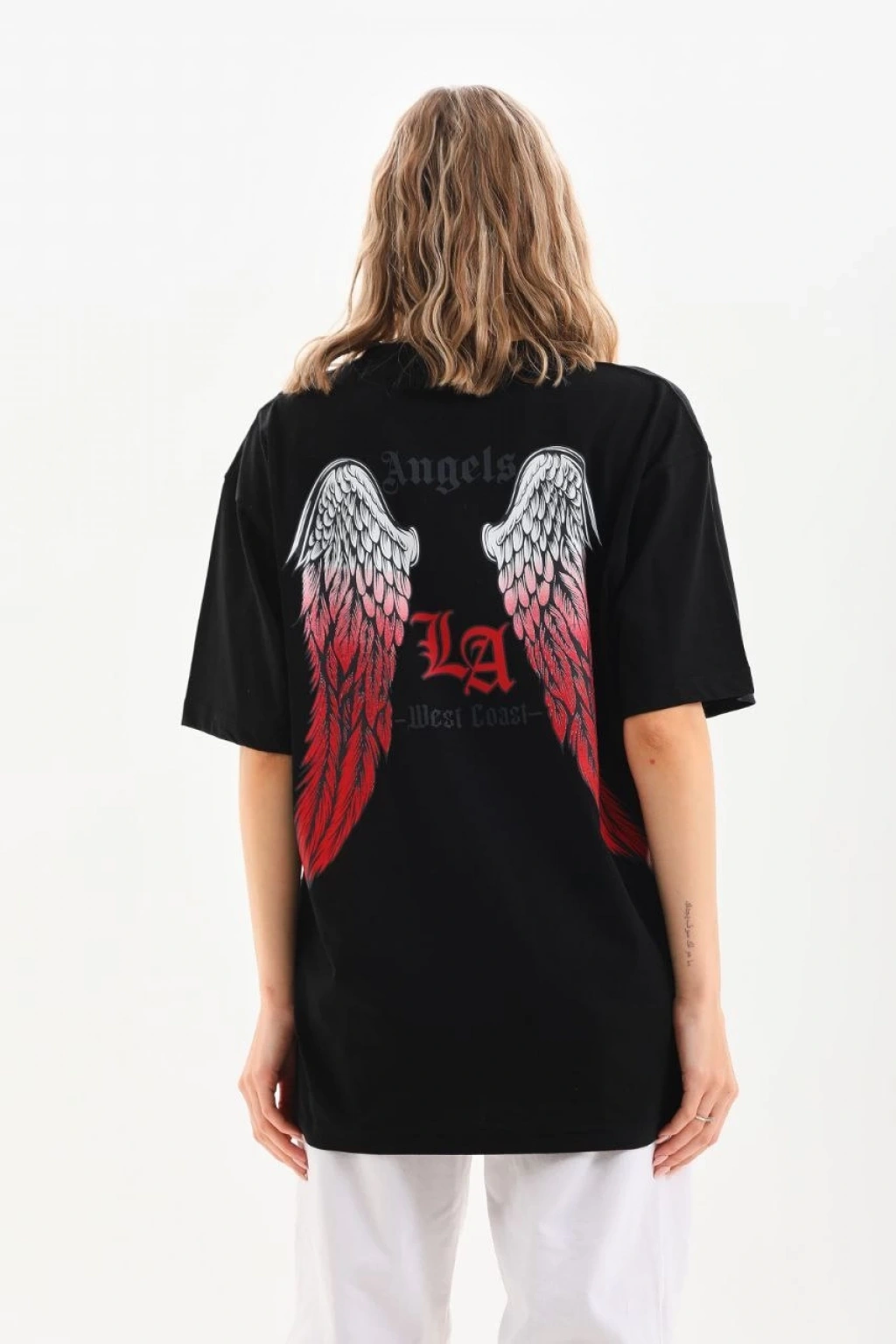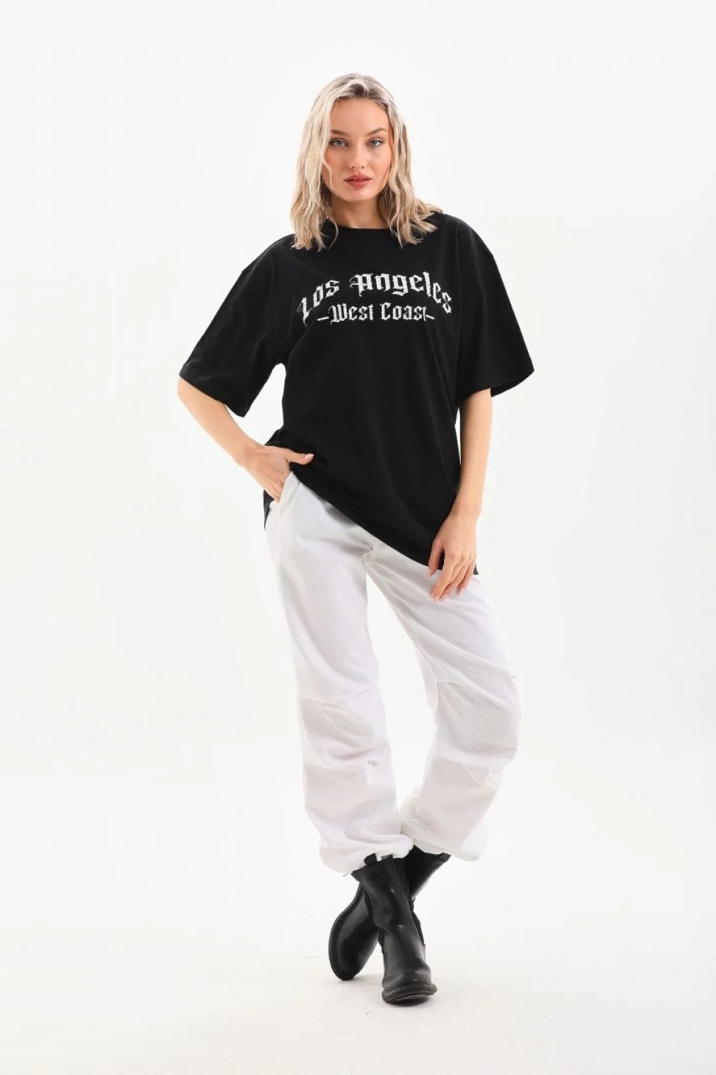 Unisex Bisiklet Yaka Baskılı Oversize T-Shirt - Siyah