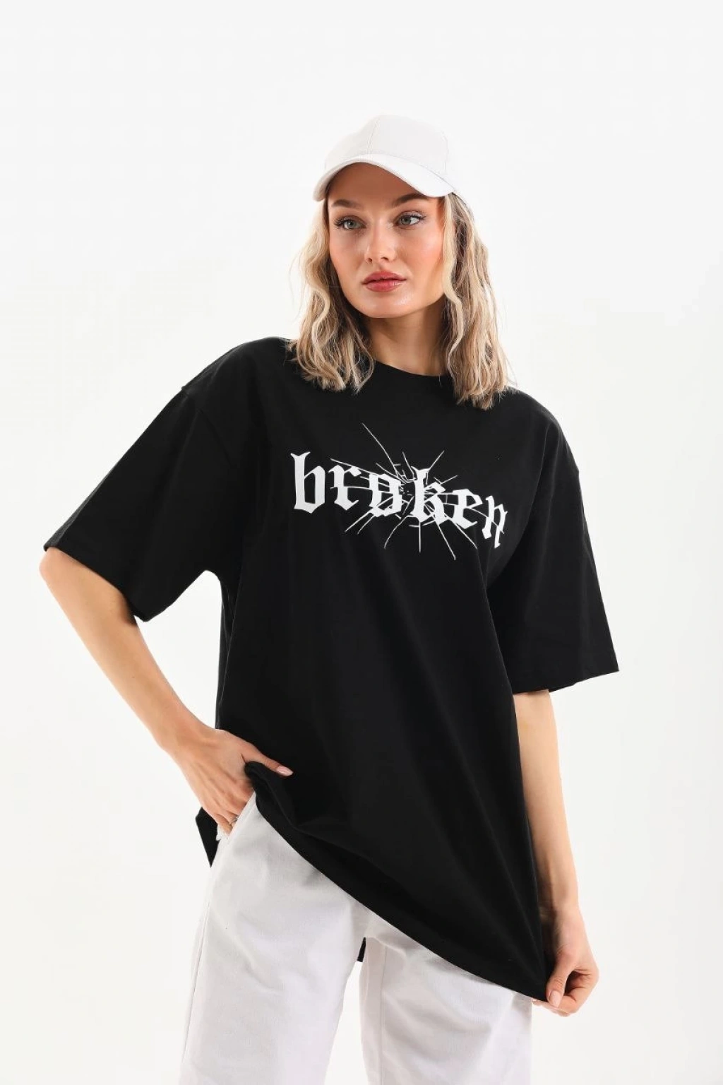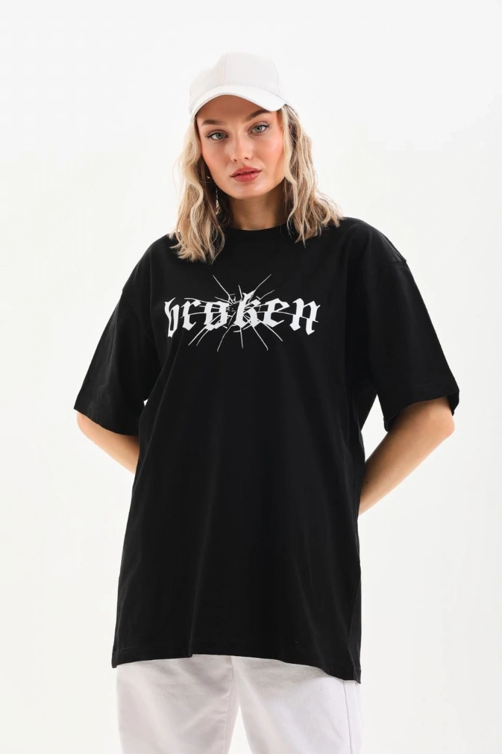 Unisex Bisiklet Yaka Baskılı Oversize T-Shirt - Siyah
