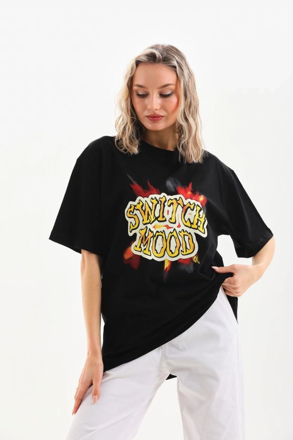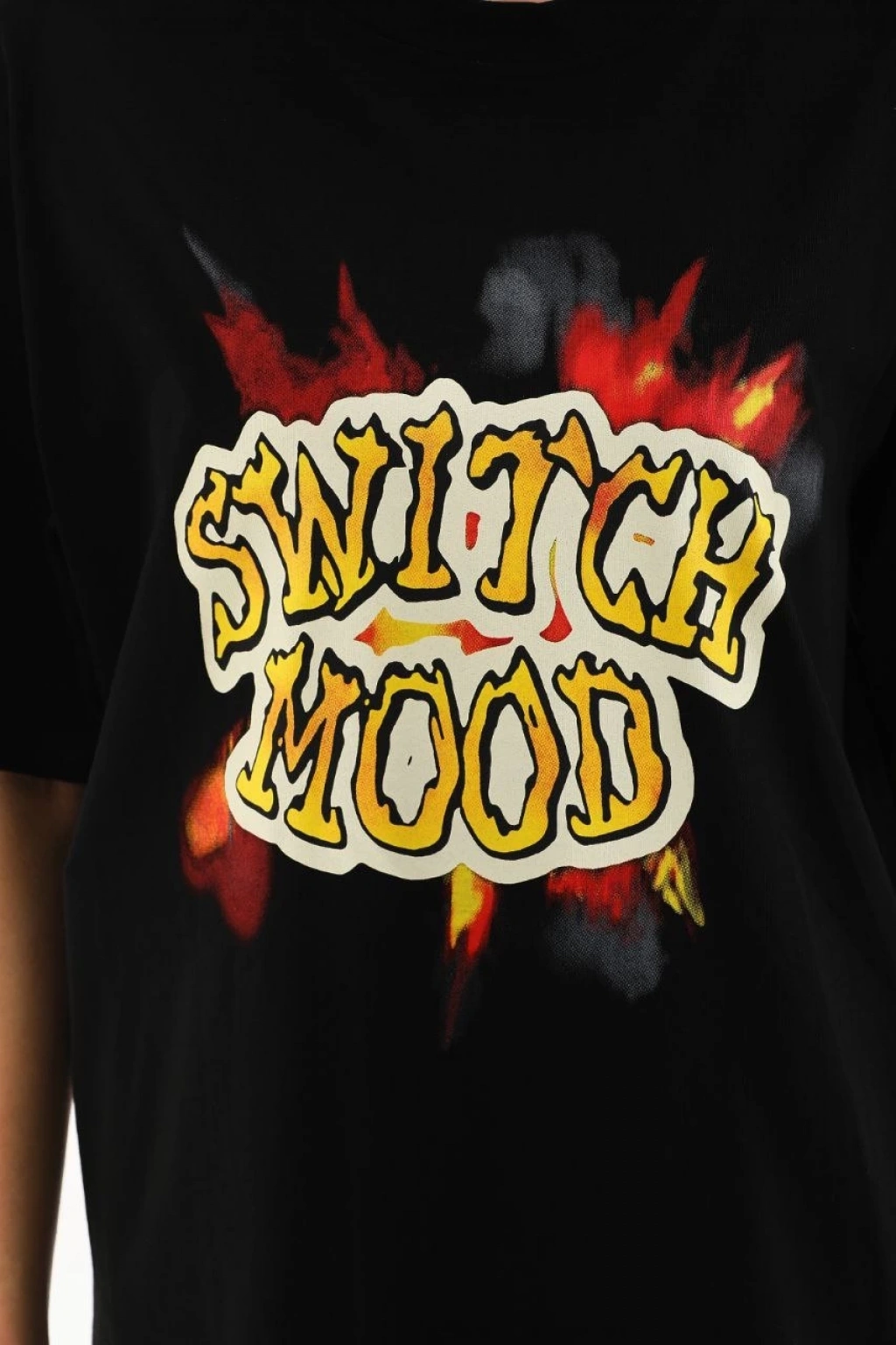 Unisex Bisiklet Yaka Baskılı Oversize T-Shirt - Siyah