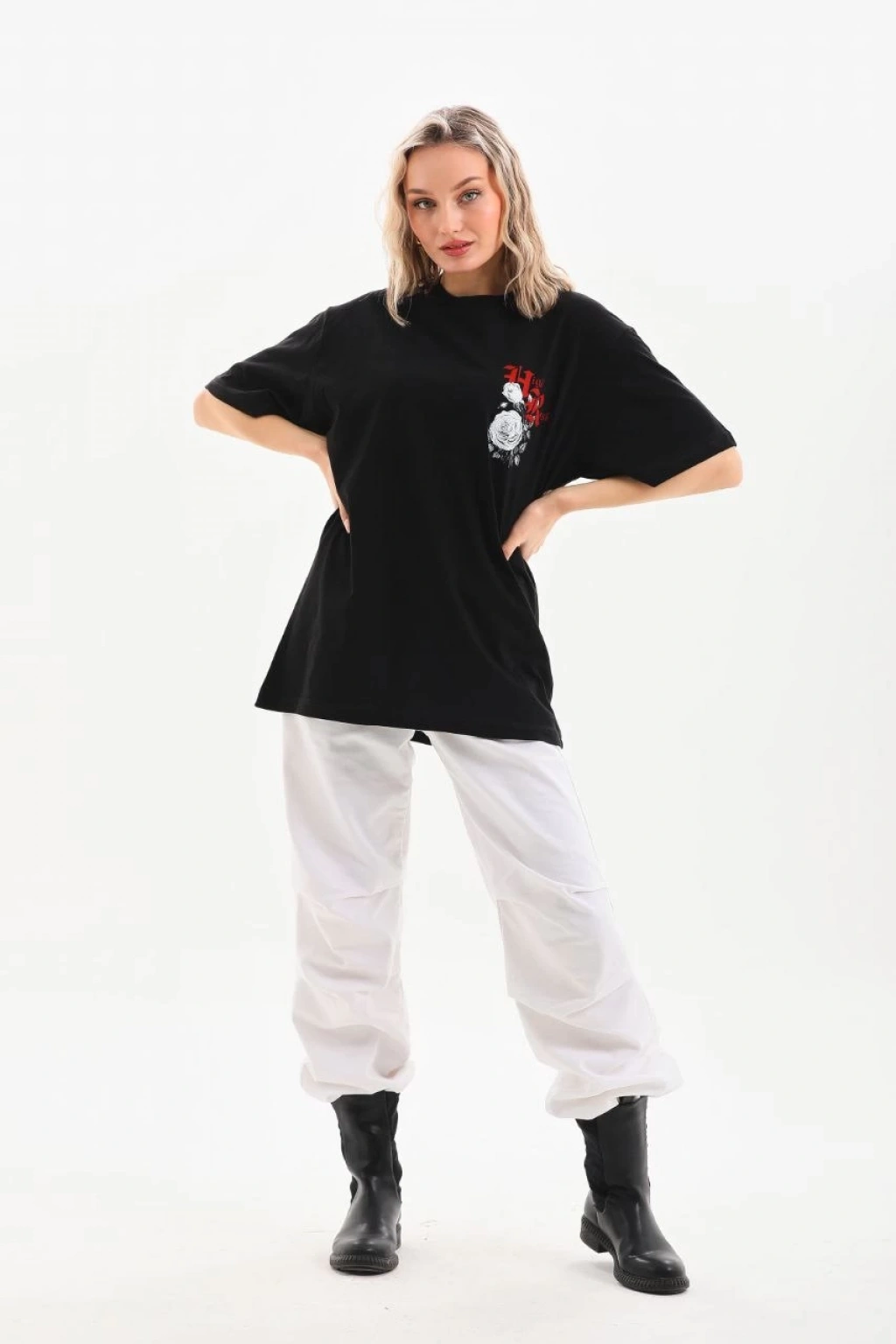 AICG Ön Arka Baskılı Bisiklet Yaka Kadın Oversize Bisiklet Yaka T-shirt - Siyah