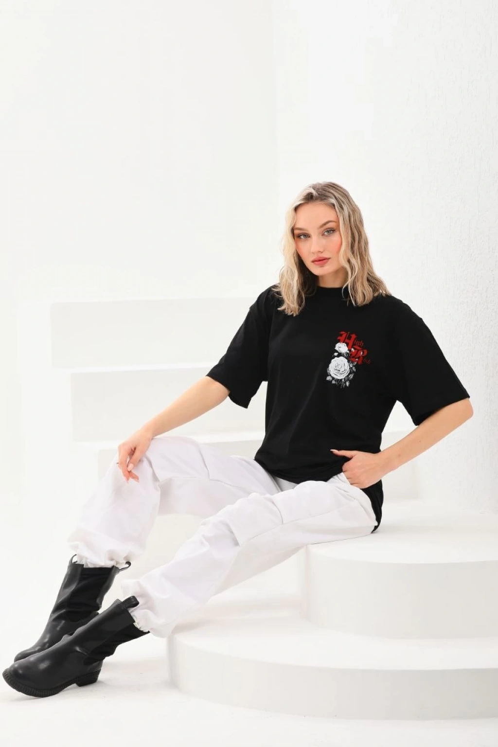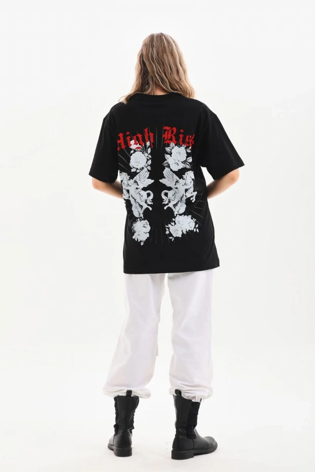 Unisex Bisiklet Yaka Baskılı Oversize T-Shirt - Siyah