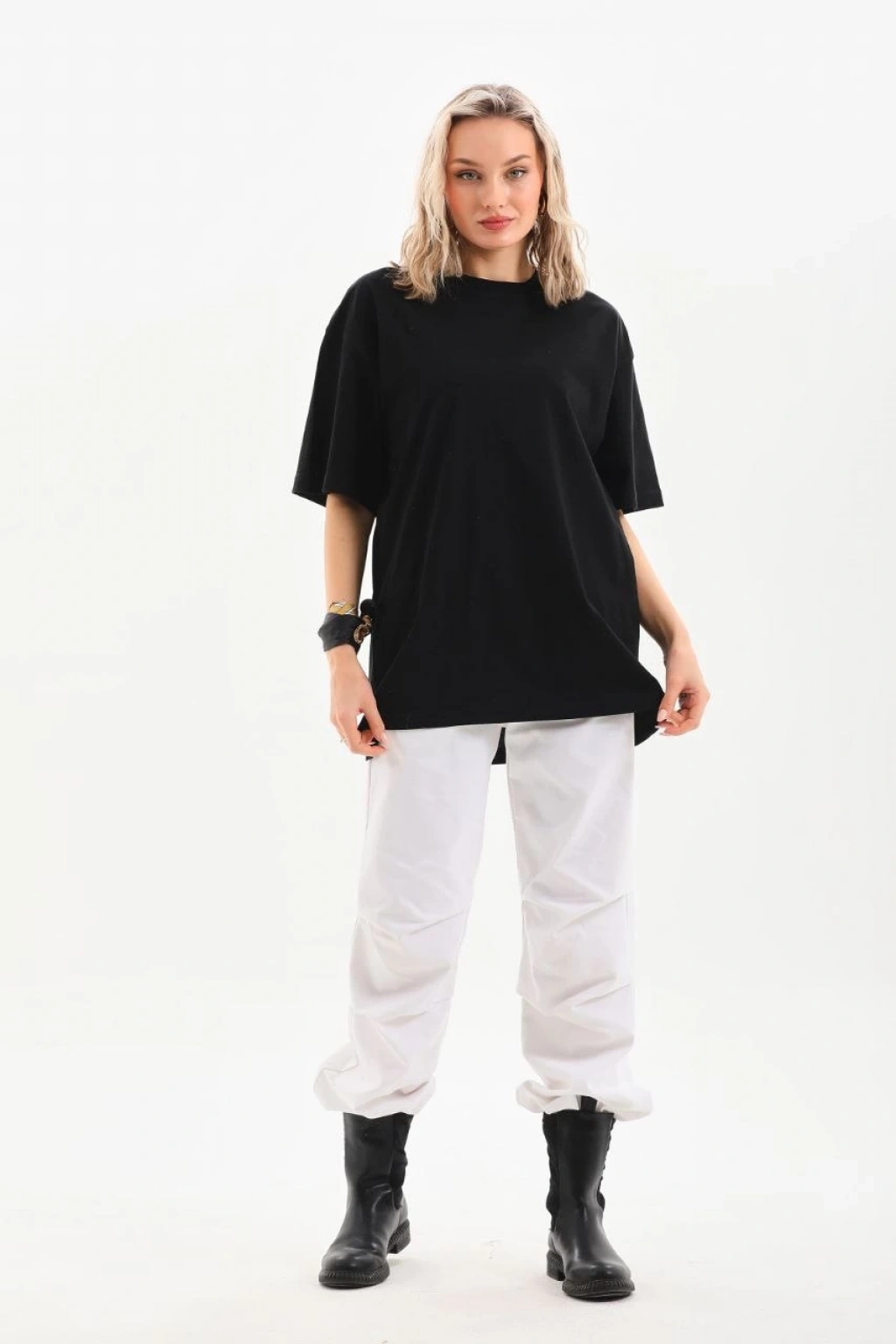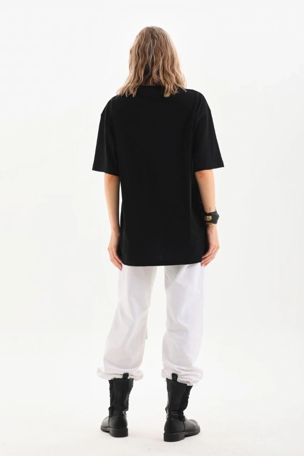 AICG ÖN ARKA BASKILI BİSİKLET YAKA KADIN OVERSİZE BİSİKLET YAKA T-SHİRT - SİYAH