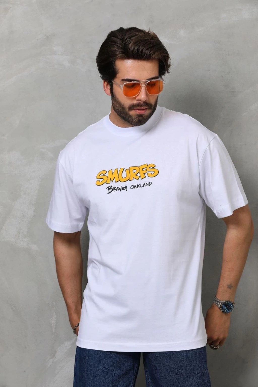 Unisex Bisiklet Yaka Baskılı Oversize T-Shirt - Beyaz