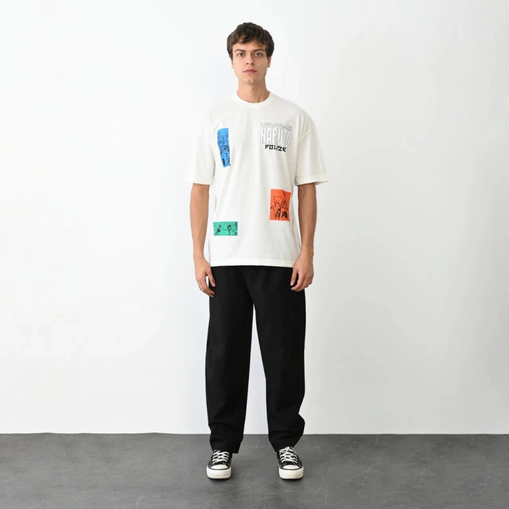 Unisex Bisiklet Yaka Baskılı Oversize T-Shirt - Beyaz