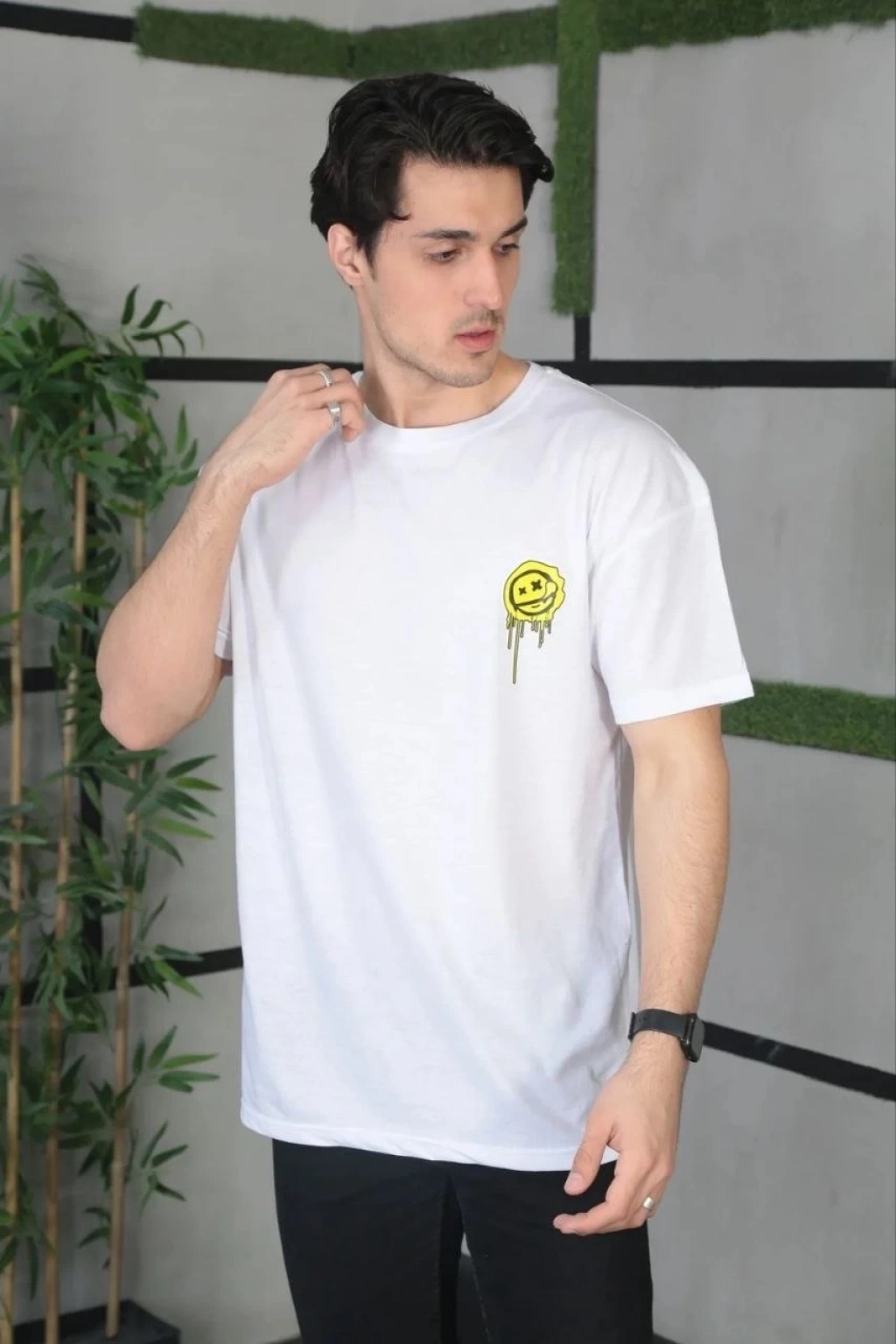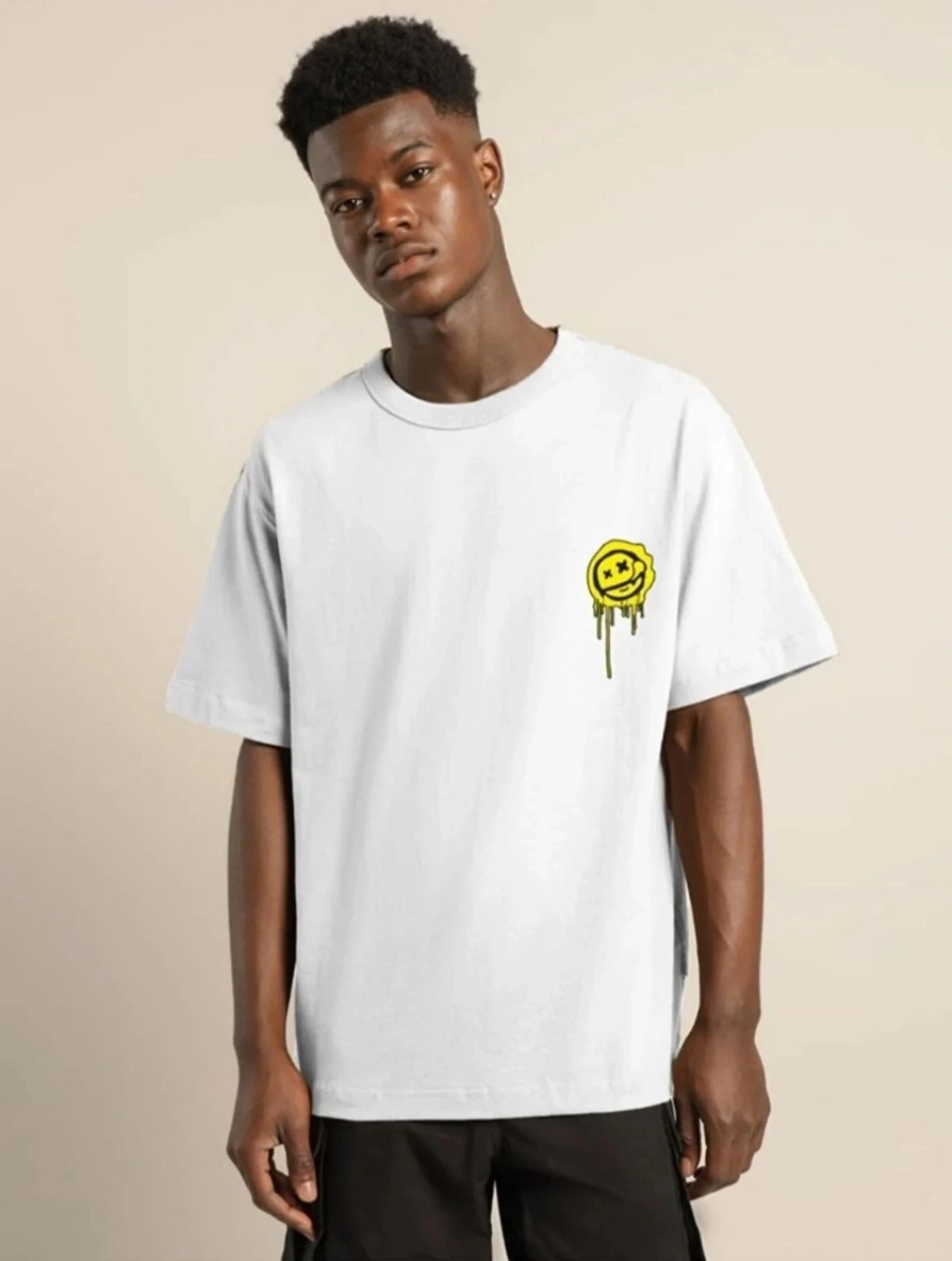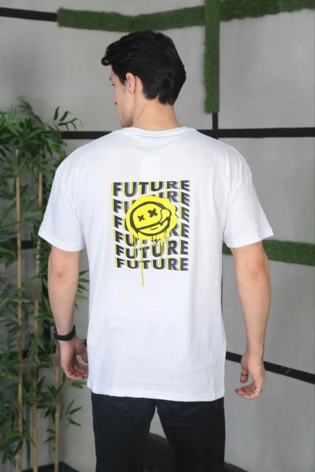 Unisex Bisiklet Yaka Baskılı Oversize T-Shirt - Beyaz
