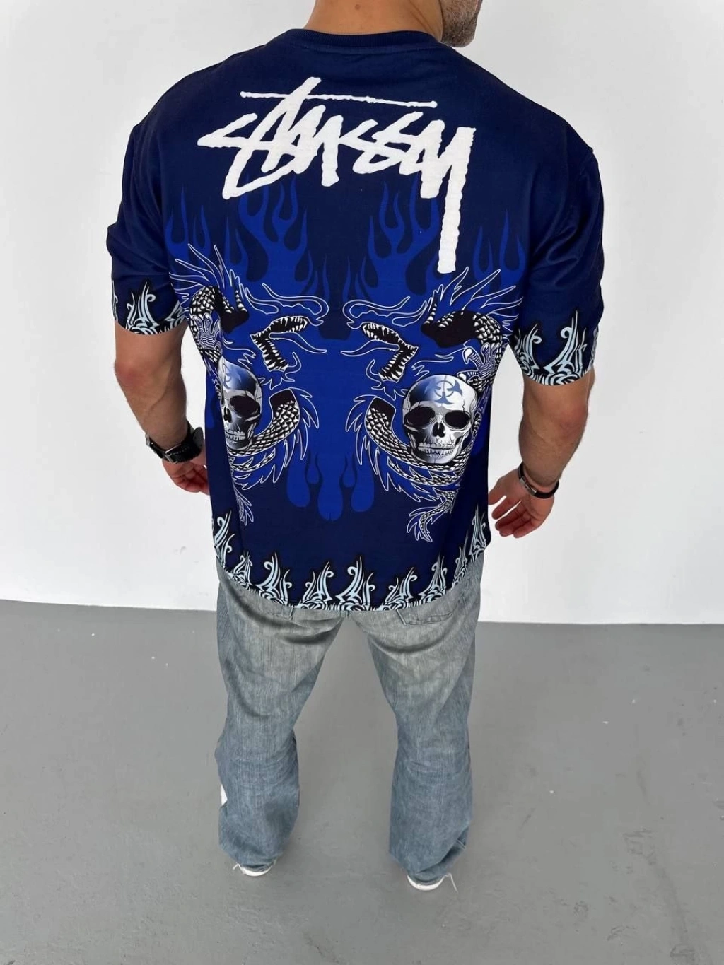 Unisex Bisiklet Yaka Baskılı Oversize T-Shirt - Lacivert