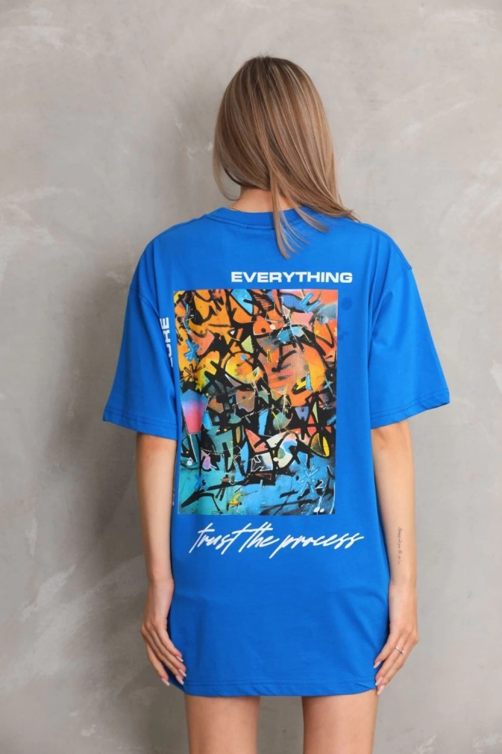 Unisex Bisiklet Yaka Baskılı Oversize T-Shirt - Siyah