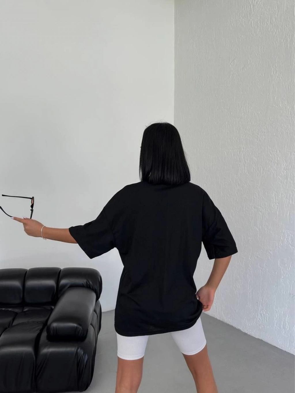 AICG Ön Arka Baskılı Bisiklet Yaka Kadın Oversize Bisiklet Yaka T-shirt - Siyah
