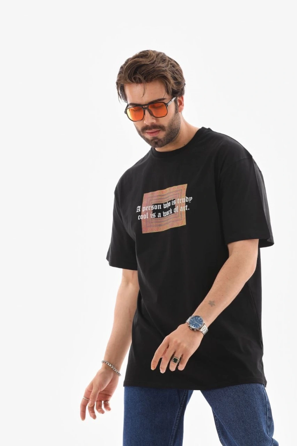 Unisex Bisiklet Yaka Baskılı Oversize T-Shirt - Siyah