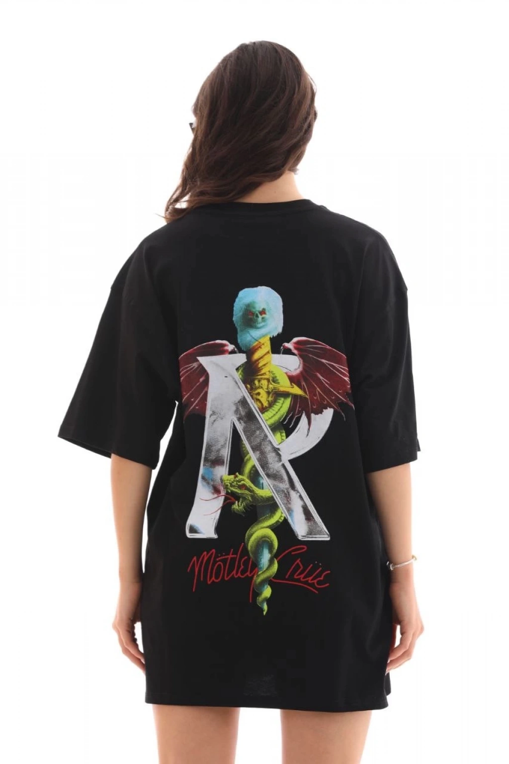 Newtro Baskılı Oversize Bisiklet Yaka T-shirt - Siyah