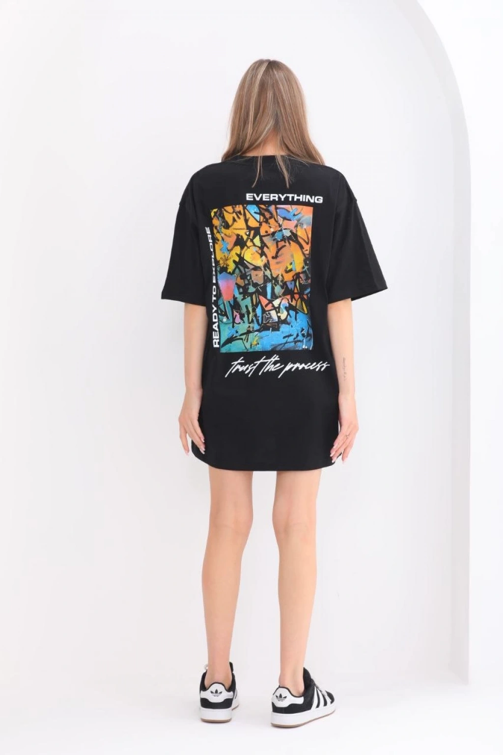 Unisex Bisiklet Yaka Baskılı Oversize T-Shirt - Beyaz