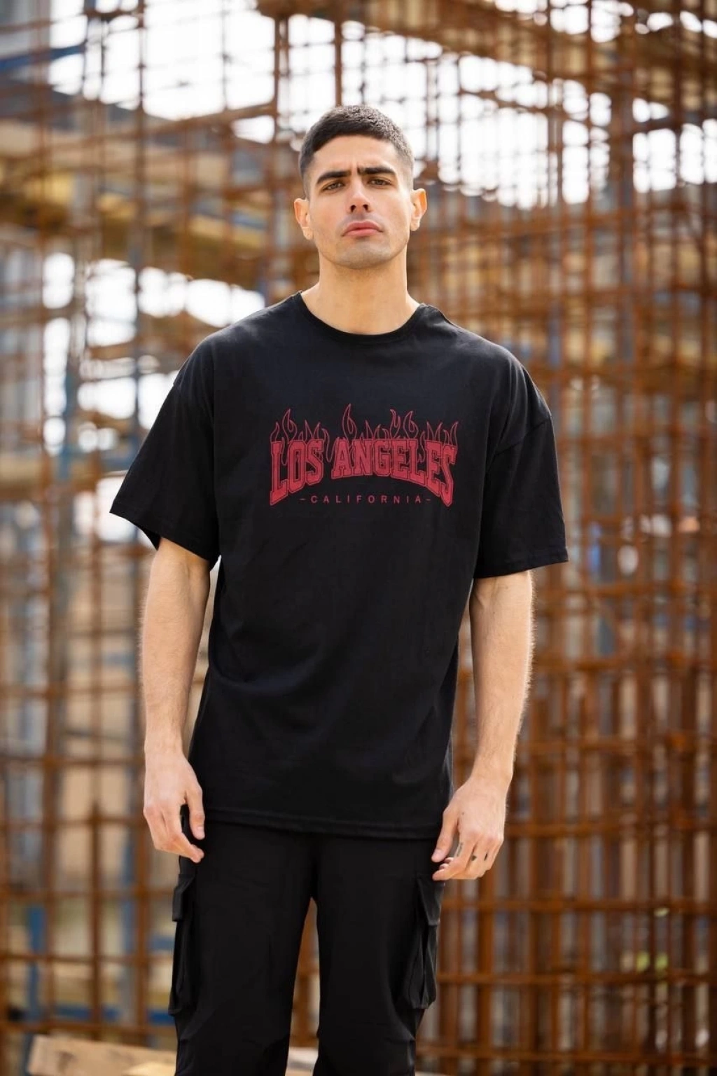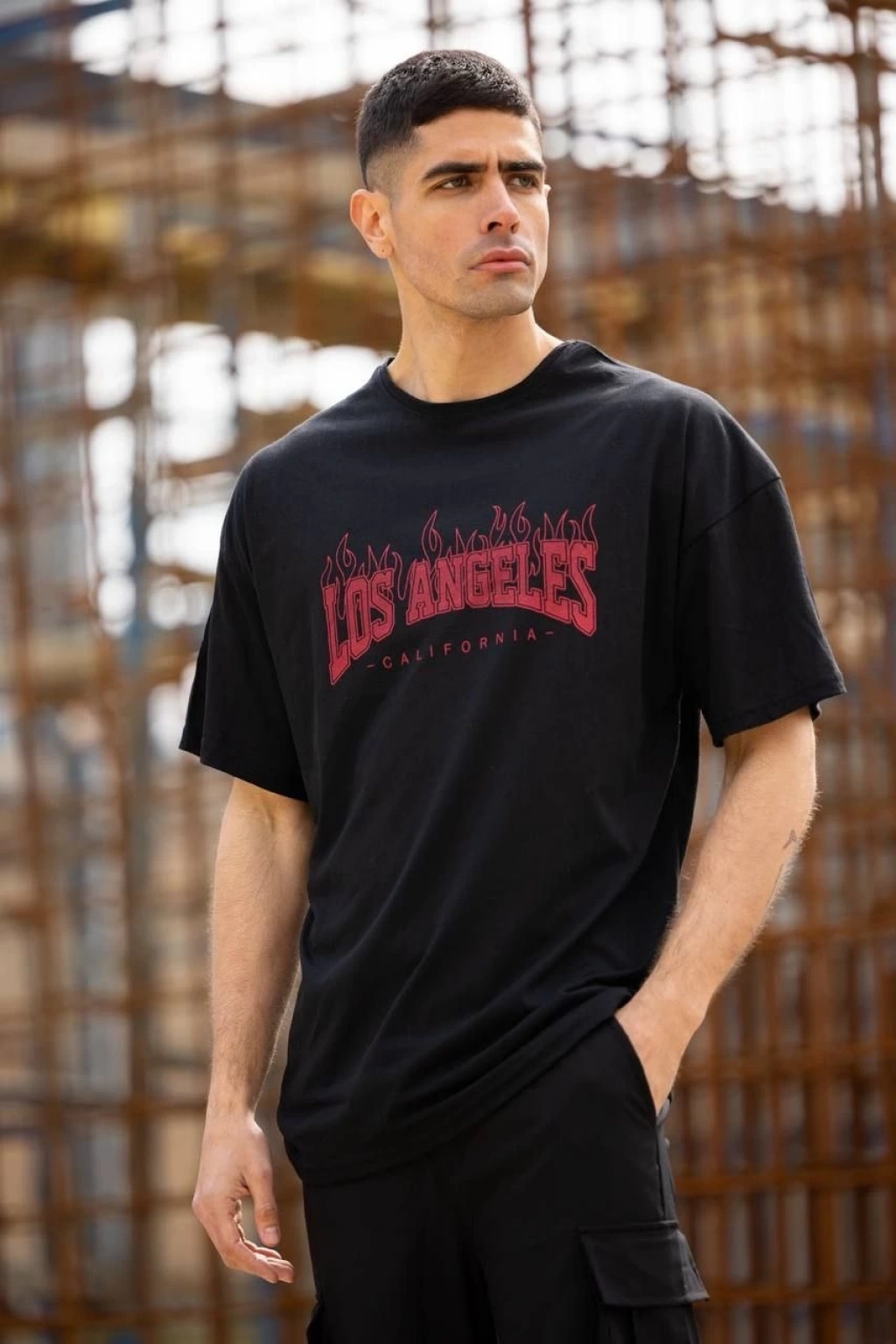 Unisex Bisiklet Yaka Baskılı Oversize T-Shirt - Siyah