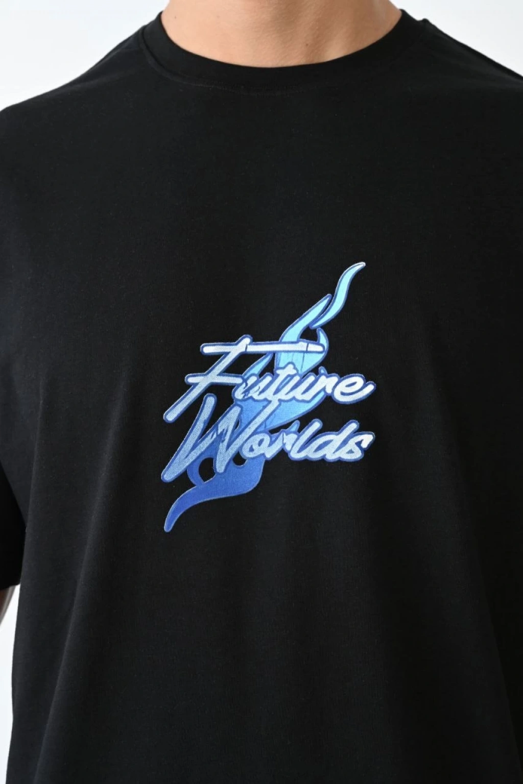 Erkek Asit Yıkama Bisiklet Yaka Kısa Kollu Oversize T-Shirt Tişört - Siyah