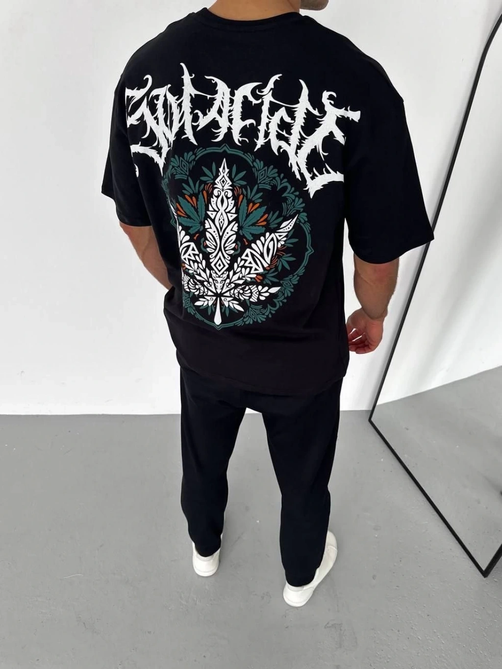 Erkek Asit Yıkama Bisiklet Yaka Kısa Kollu Oversize T-Shirt Tişört - Siyah