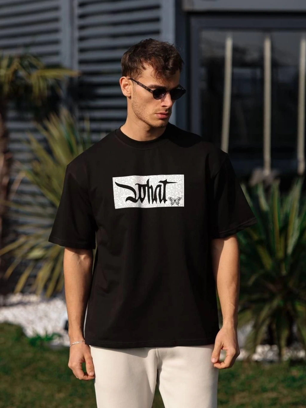 Erkek Asit Yıkama Bisiklet Yaka Kısa Kollu Oversize T-Shirt Tişört - Siyah