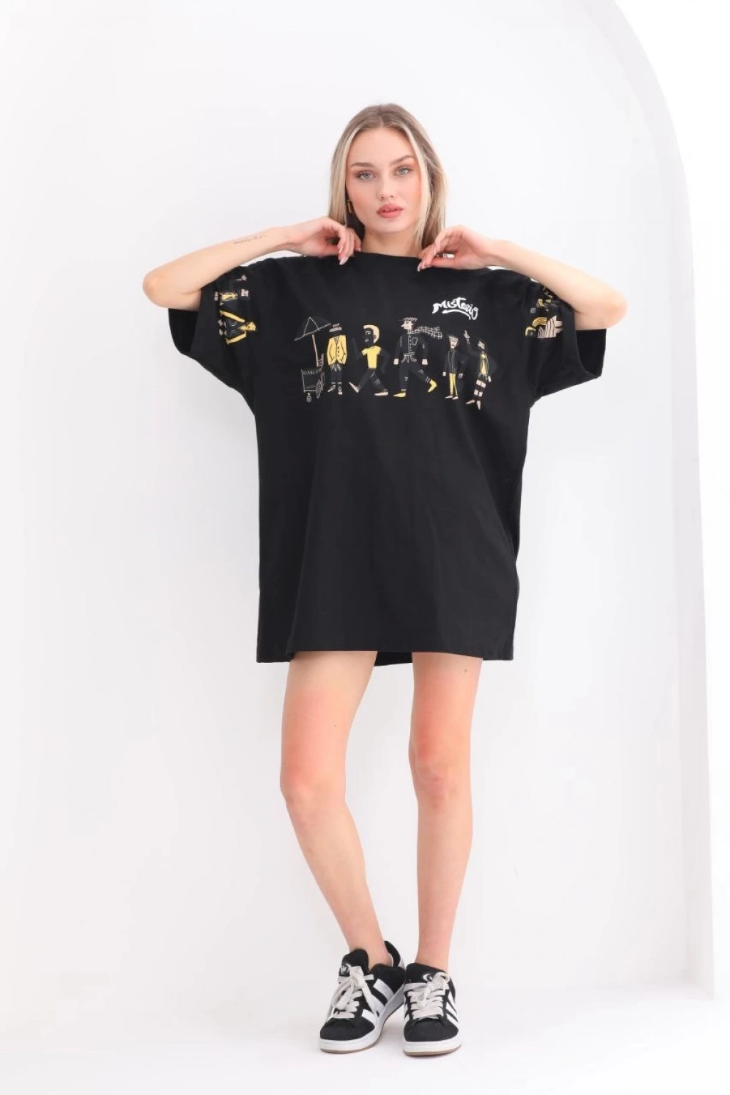 Ördek Baskılı ve Yuvarlak Yakalı Kadın Günlük Büyük Boy Siyah Tişört. - Siyah