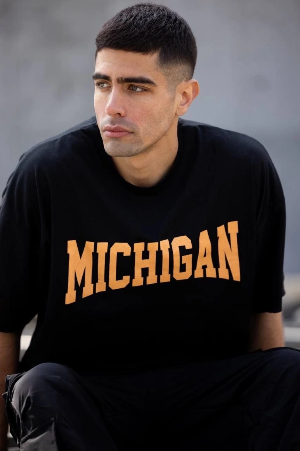 Erkek OversizeGrafik Tişört "CAMPBRASTCOOPERATION" Kalın Yazı Bisiklet Yaka, Kısa Kol, Kalın Mor ve Siyah Desenli Yazlık Sokak Kıyafeti - Siyah