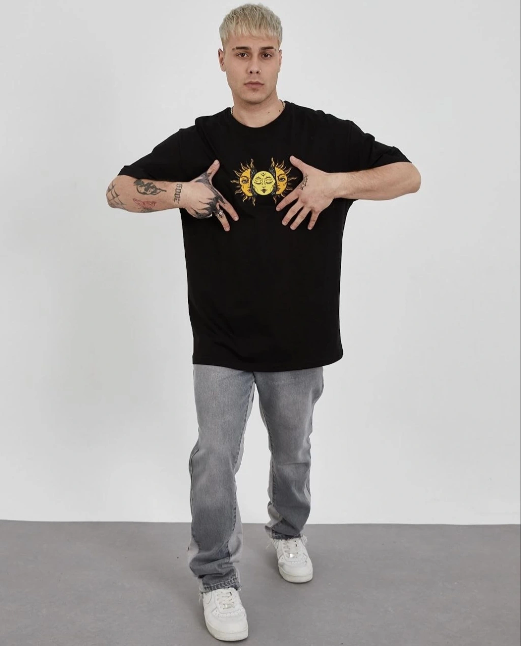 Unisex Bisiklet Yaka Baskılı Oversize T-Shirt - Siyah