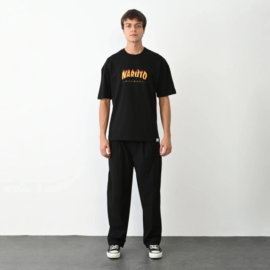 Unisex Bisiklet Yaka Baskılı Oversize T-Shirt - Siyah