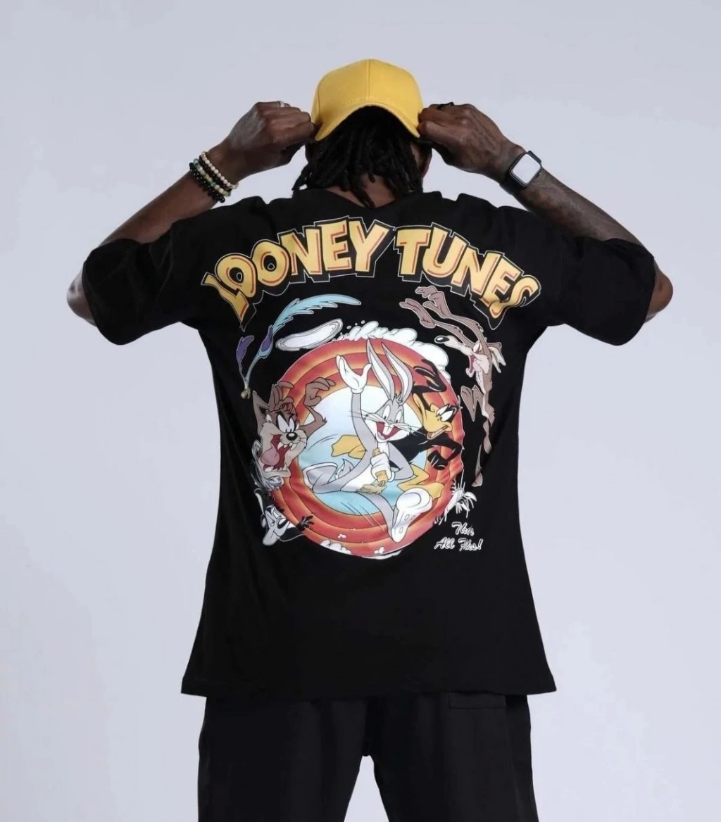 Benzersiz Sırt Baskılı Erkek Sokak Stili Bol Tişört - Nefes Alabilir Polyester, Makinede Yıkanabilir - Siyah