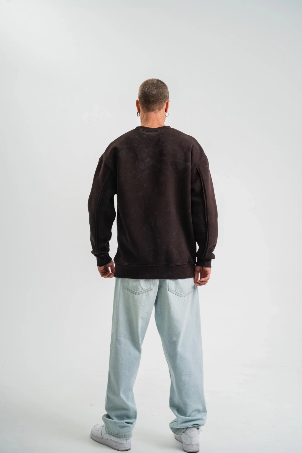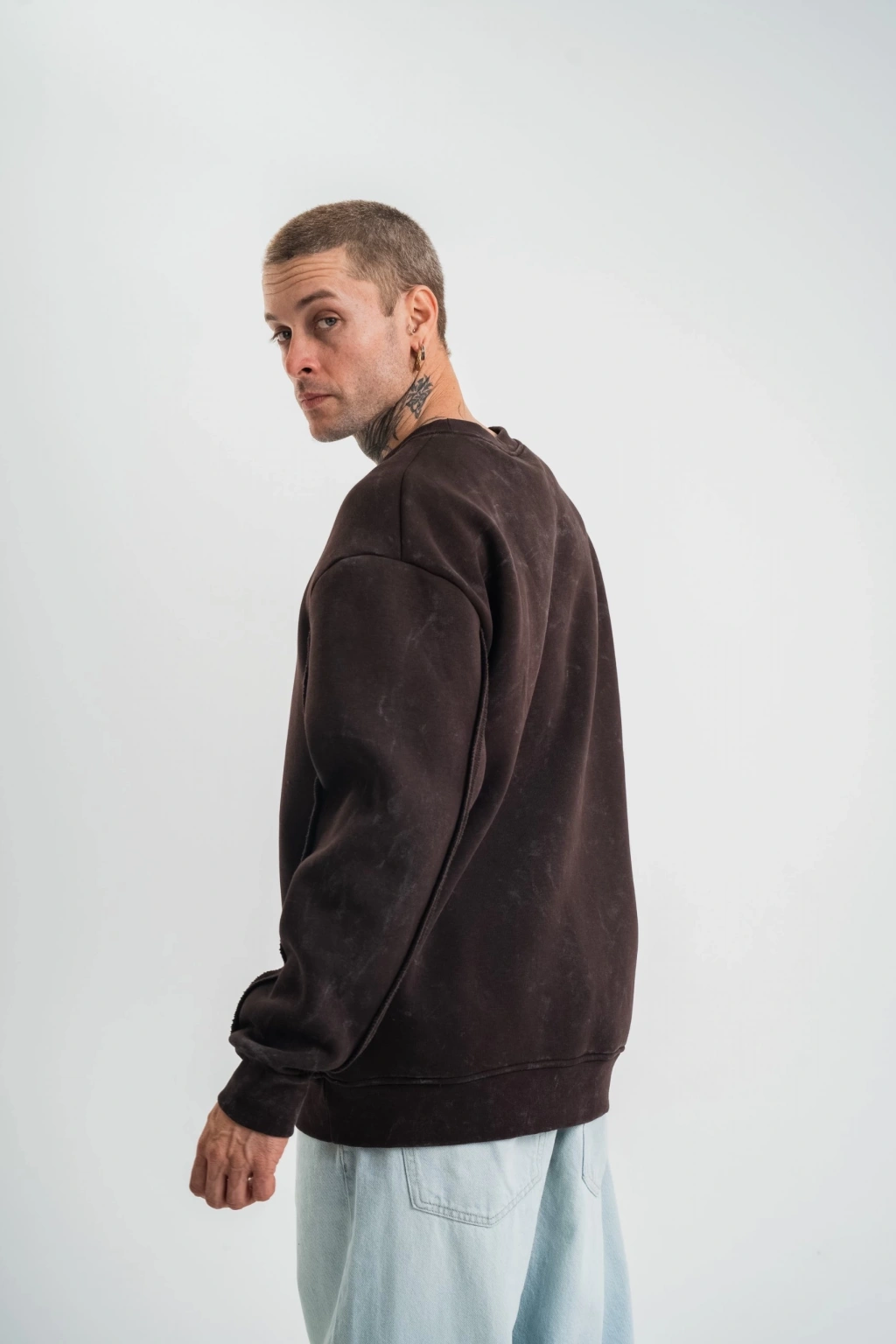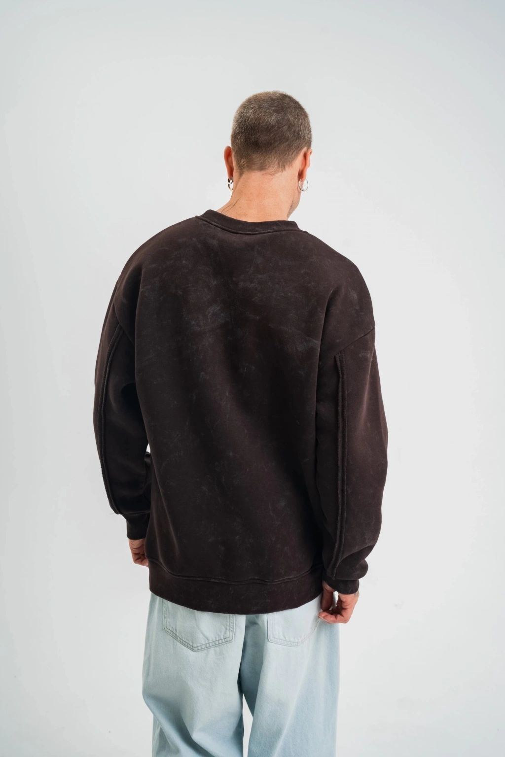 Unisex Bisiklet Yaka Özel Pis Dikişli Yıkamalı SweatShirt - Siyah