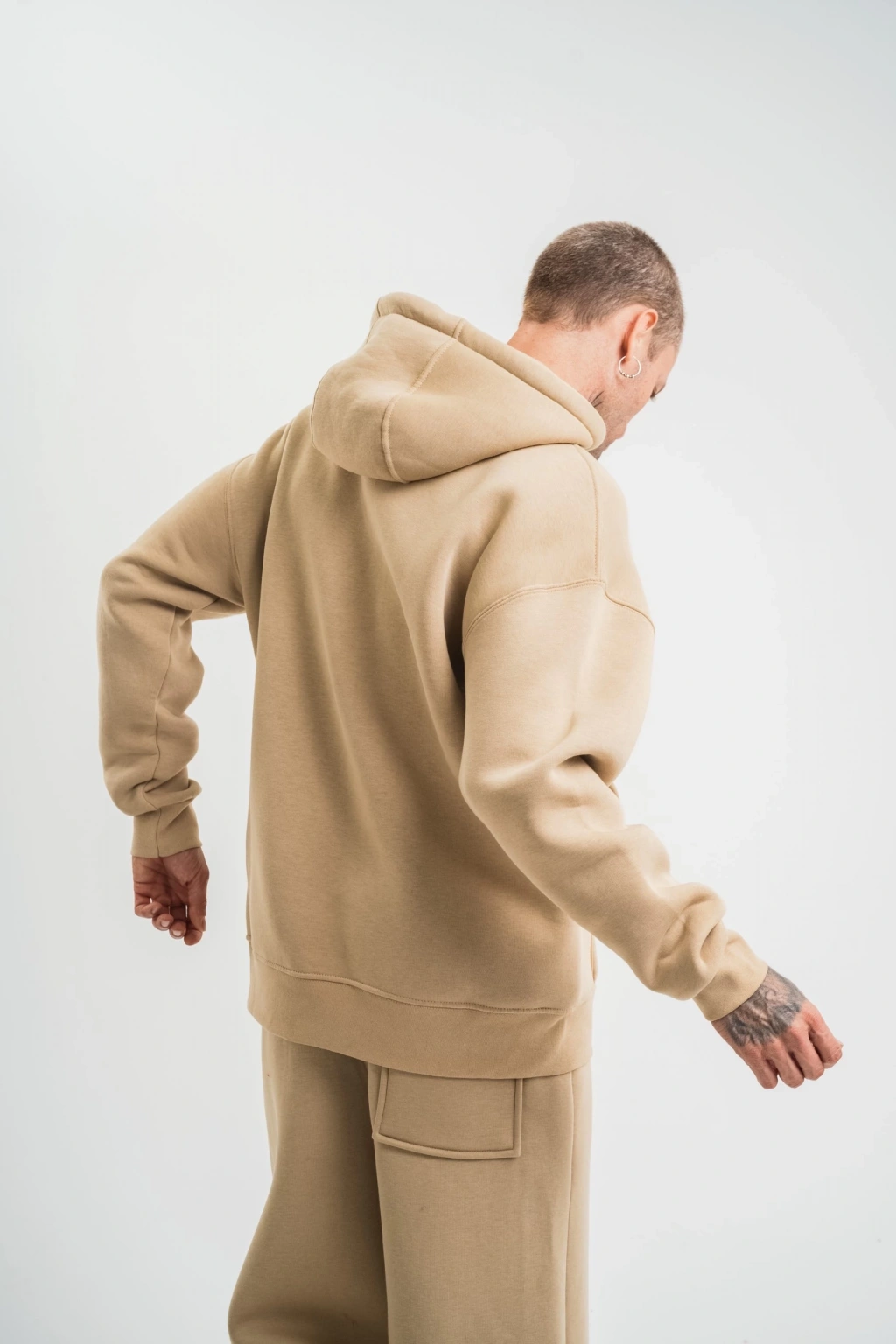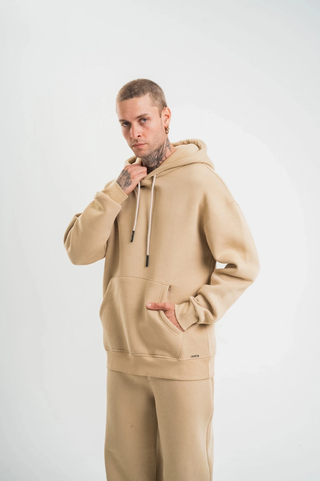 Erkek Ovarsize Kapüşonlu Swetshirt Kanguru Çepli Cıtcıtlı 3 iplik Şardonlu Hoodie - Haki