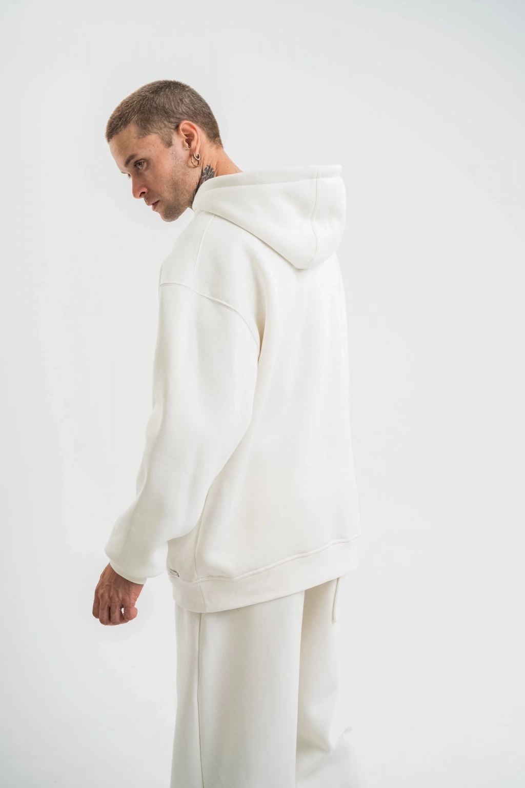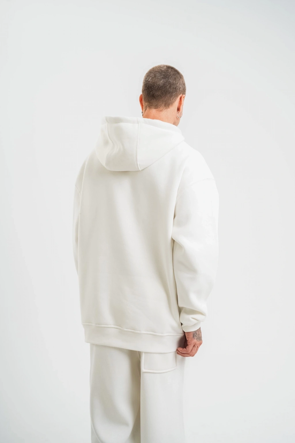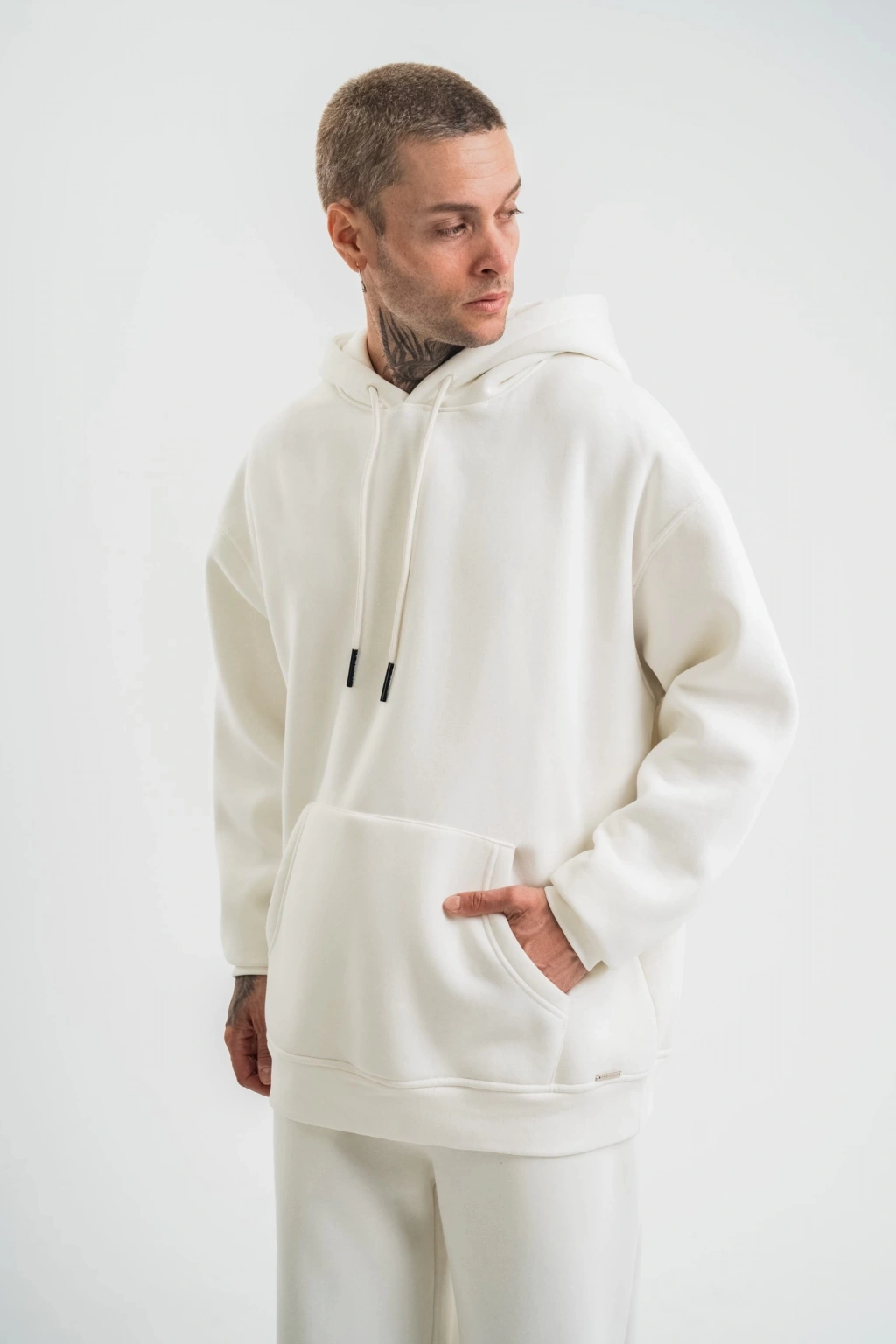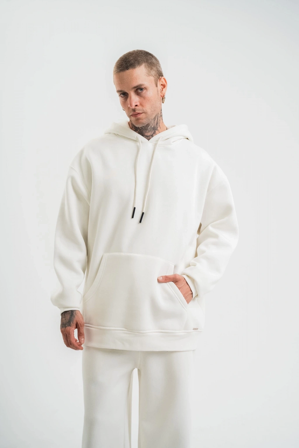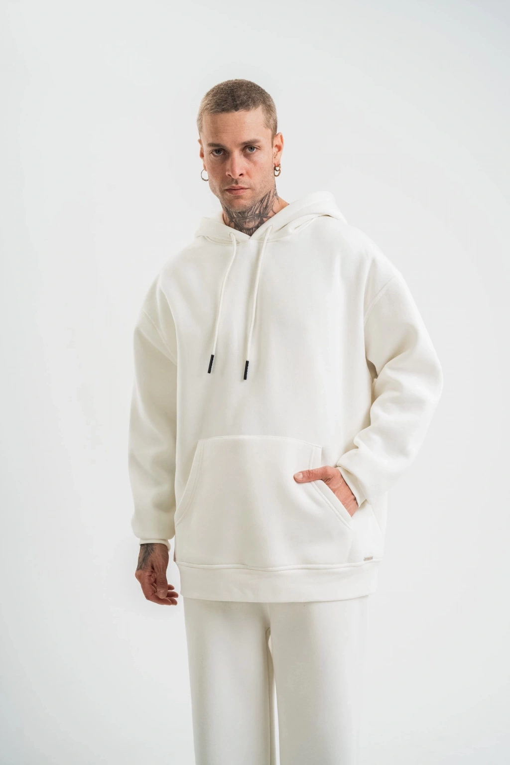 Erkek Ovarsize Kapüşonlu Swetshirt Kanguru Çepli Cıtcıtlı 3 iplik Şardonlu Hoodie - Beyaz