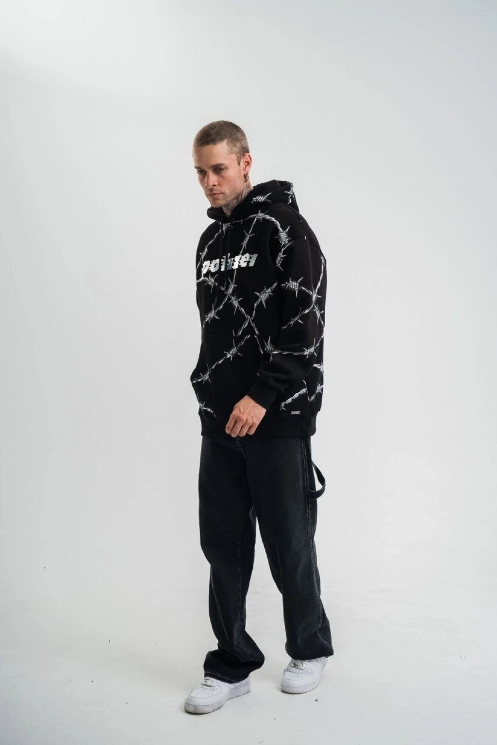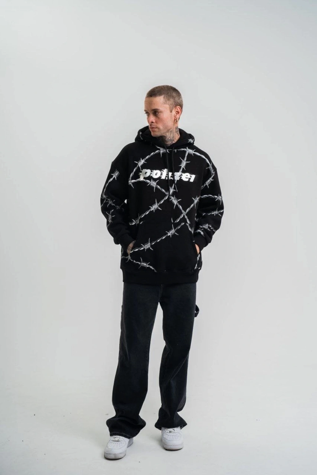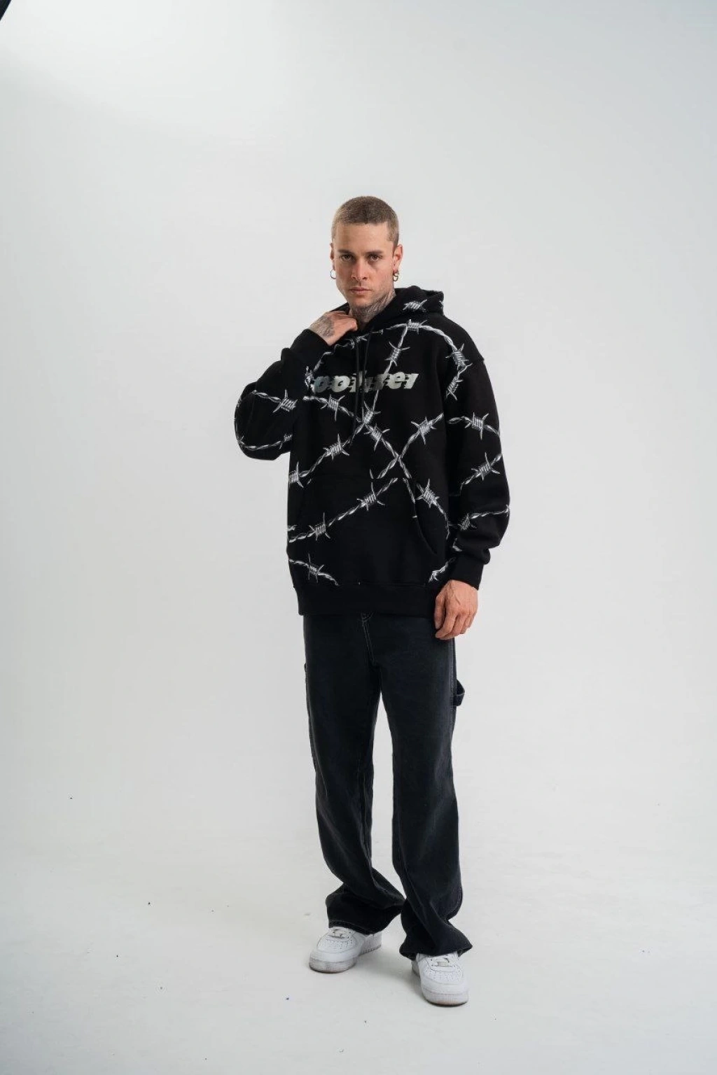 Erkek Oversize Üç İplik Kapüşonlu Sweat – Siyah Kol ve Etek Ribana Detaylı, Ön ve Sırt Baskılı, Kanguru Cepli Rahat Kalıp Model