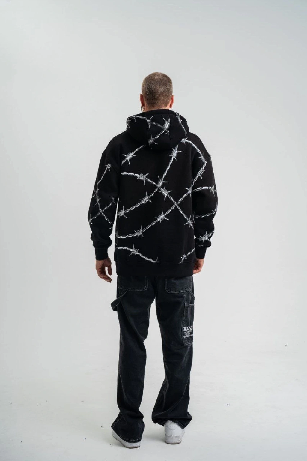 Erkek Oversize Üç İplik Kapüşonlu Sweatshirt – Siyah Sırt ve Ön Baskılı, Kanguru Cepli, Rahat Kalıp, İçi Pamuklu ModeL-Siyah
