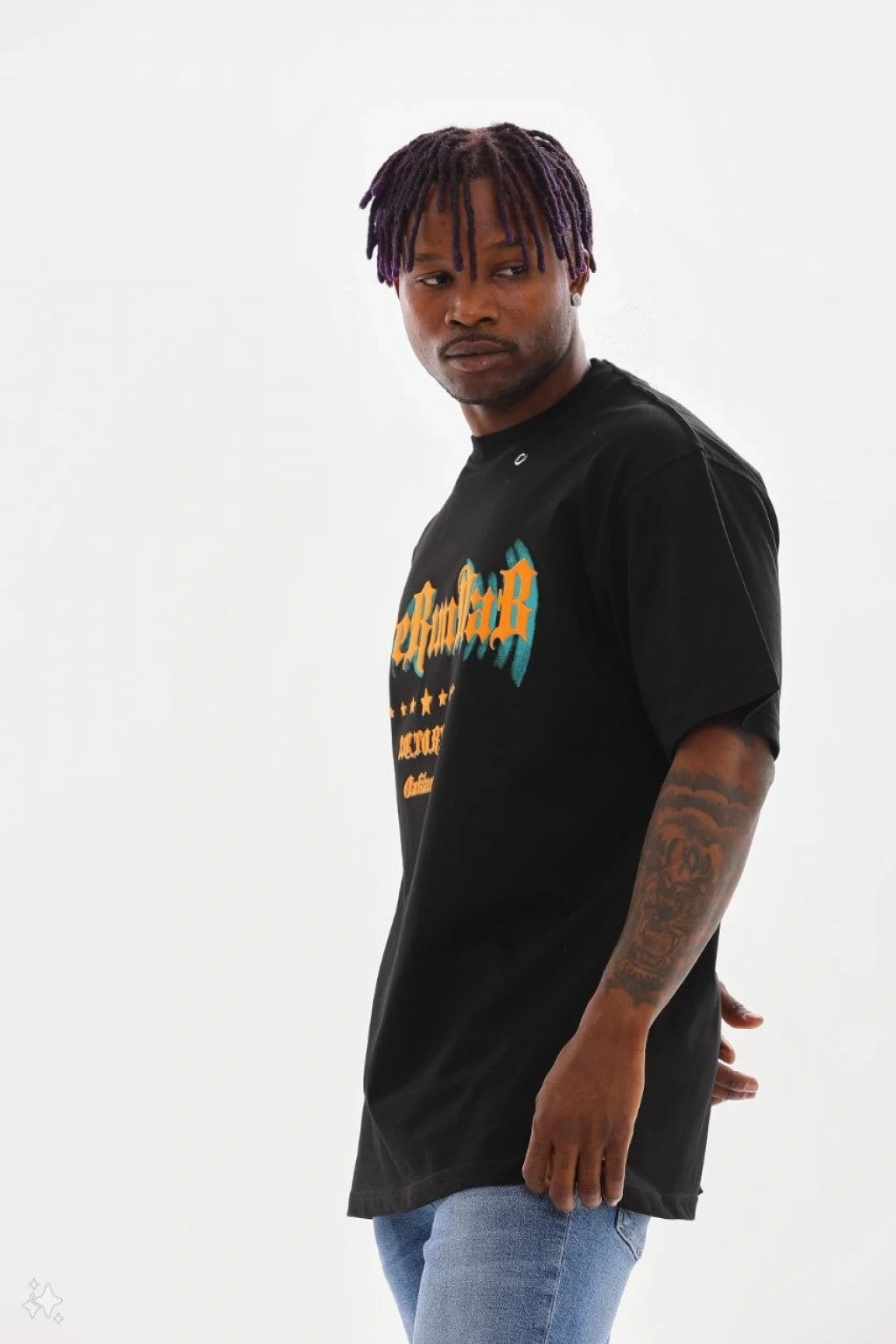 Erkek OversizeGrafik Tişört "CAMPBRASTCOOPERATION" Kalın Yazı Bisiklet Yaka, Kısa Kol, Kalın Mor ve Siyah Desenli Yazlık Sokak Kıyafeti - Siyah